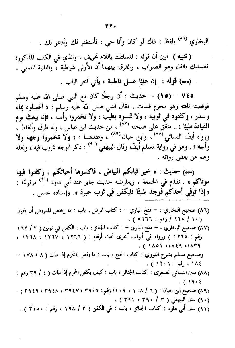 745 - (15) - حَدِيثٌ: «أَنَّ رَجُلًا كَانَ مَعَ النَّبِيِّ - صَلَّى اللَّهُ عَلَيْهِ وَسَلَّمَ - فَوَقَصَتْهُ نَاقَتُهُ وَهُوَ مُحْرِمٌ فَمَاتَ، فَقَالَ النَّبِيُّ - صَلَّى اللَّهُ عَلَيْهِ وَسَلَّمَ -: اغْسِلُوهُ بِمَاءٍ وَسِدْرٍ، وَكَفِّنُوهُ فِي ثَوْبَيْهِ، وَلَا تُمِسُّوهُ بِطِيبٍ، وَلَا تُخَمِّرُوا رَأْسَهُ، فَإِنَّهُ يُبْعَثُ يَوْمَ الْقِيَامَةِ مُلَبِّيًا» . مُتَّفَقٌ عَلَى صِحَّتِهِ، مِنْ حَدِيثِ ابْنِ عَبَّاسٍ، وَلَهُ طُرُقٌ وَأَلْفَاظٌ، وَرَوَاهُ أَيْضًا النَّسَائِيُّ، وَابْنُ حِبَّانَ، وَعِنْدَهُمَا: «وَلَا تُخَمِّرُوا وَجْهَهُ وَلَا رَأْسَهُ» . وَهُوَ فِي رِوَايَةٍ لِمُسْلِمٍ أَيْضًا وَقَالَ الْبَيْهَقِيُّ: ذِكْرُ الْوَجْهِ غَرِيبٌ فِيهِ، وَلَعَلَّهُ وَهِمَ مِنْ بَعْضِ رُوَاتِهِ.