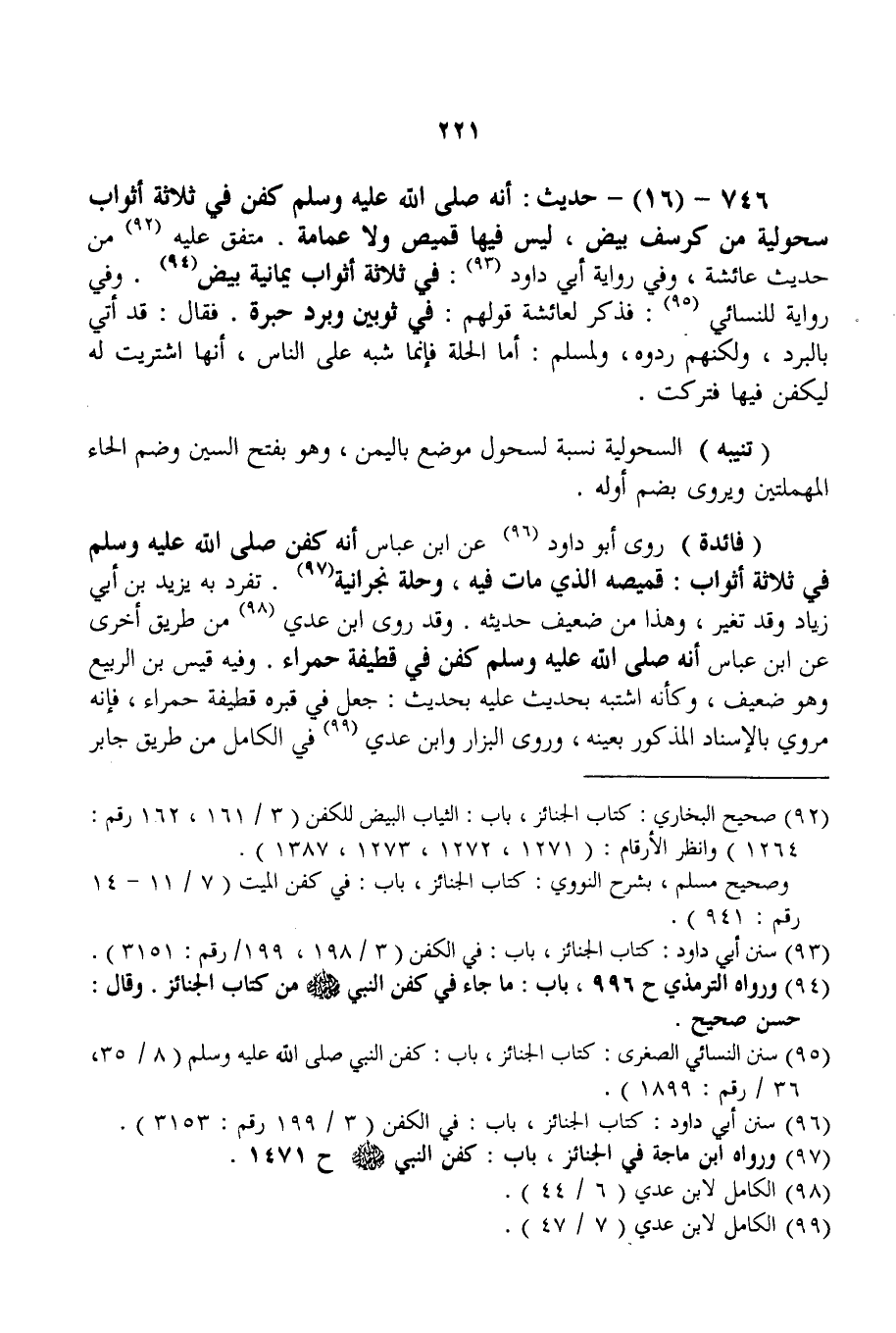 746 - (16) - حَدِيثٌ: «أَنَّهُ - صَلَّى اللَّهُ عَلَيْهِ وَسَلَّمَ - كُفِّنَ فِي ثَلَاثَةِ أَثْوَابٍ سَحُولِيَّةٍ مِنْ كُرْسُفٍ بِيضٍ، لَيْسَ فِيهَا قَمِيصٌ وَلَا عِمَامَةٌ» . مُتَّفَقٌ عَلَيْهِ مِنْ حَدِيثِ عَائِشَةَ، وَفِي رِوَايَةِ أَبِي دَاوُد: فِي ثَلَاثَةِ أَثْوَابٍ يَمَانِيَّةٍ بِيضٍ وَفِي رِوَايَةٍ لِلنَّسَائِيِّ: فَذَكَرَ لِعَائِشَةَ قَوْلَهُمْ: فِي ثَوْبَيْنِ وَبُرْدِ حُبْرَةٍ. فَقَالَ: قَدْ أُتِيَ بِالْبُرْدِ، وَلَكِنَّهُمْ رَدُّوهُ، وَلِمُسْلِمٍ: أَمَّا الْحُلَّةُ فَإِنَّمَا شُبِّهَ عَلَى النَّاسِ، أَنَّهَا اُشْتُرِيَتْ لَهُ لِيُكَفَّنَّ فِيهَا فَتُرِكَتْ.