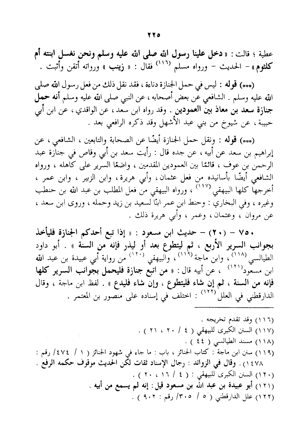 750 - (20) - حَدِيثُ ابْنِ مَسْعُودٍ: «إذَا تَبِعَ أَحَدُكُمْ الْجِنَازَةَ فَلْيَأْخُذْ بِجَوَانِبِ السَّرِيرِ الْأَرْبَعِ، ثُمَّ لْيَتَطَوَّعْ بَعْدُ أَوْ لِيَذَرْ فَإِنَّهُ مِنْ السُّنَّةِ» . أَبُو دَاوُد الطَّيَالِسِيُّ وَابْنُ مَاجَهْ، وَالْبَيْهَقِيُّ مِنْ رِوَايَةِ أَبِي عُبَيْدَةَ بْنِ عَبْدِ اللَّهِ بْنِ مَسْعُودَ، عَنْ أَبِيهِ قَالَ: «مَنْ اتَّبَعَ جِنَازَةً فَلْيَحْمِلْ بِجَوَانِبِ السَّرِيرِ كُلِّهَا فَإِنَّهُ مِنْ السُّنَّةِ، ثُمَّ إنْ شَاءَ فَلْيَتَطَوَّعْ، وَإِنْ شَاءَ فَلْيَدَعْ» . لَفْظُ ابْنِ مَاجَهْ، وَقَالَ الدَّارَقُطْنِيُّ فِي الْعِلَلِ: اخْتَلَفَ فِي إسْنَادِهِ عَلَى مَنْصُورِ بْنِ الْمُعْتَمِرِ.