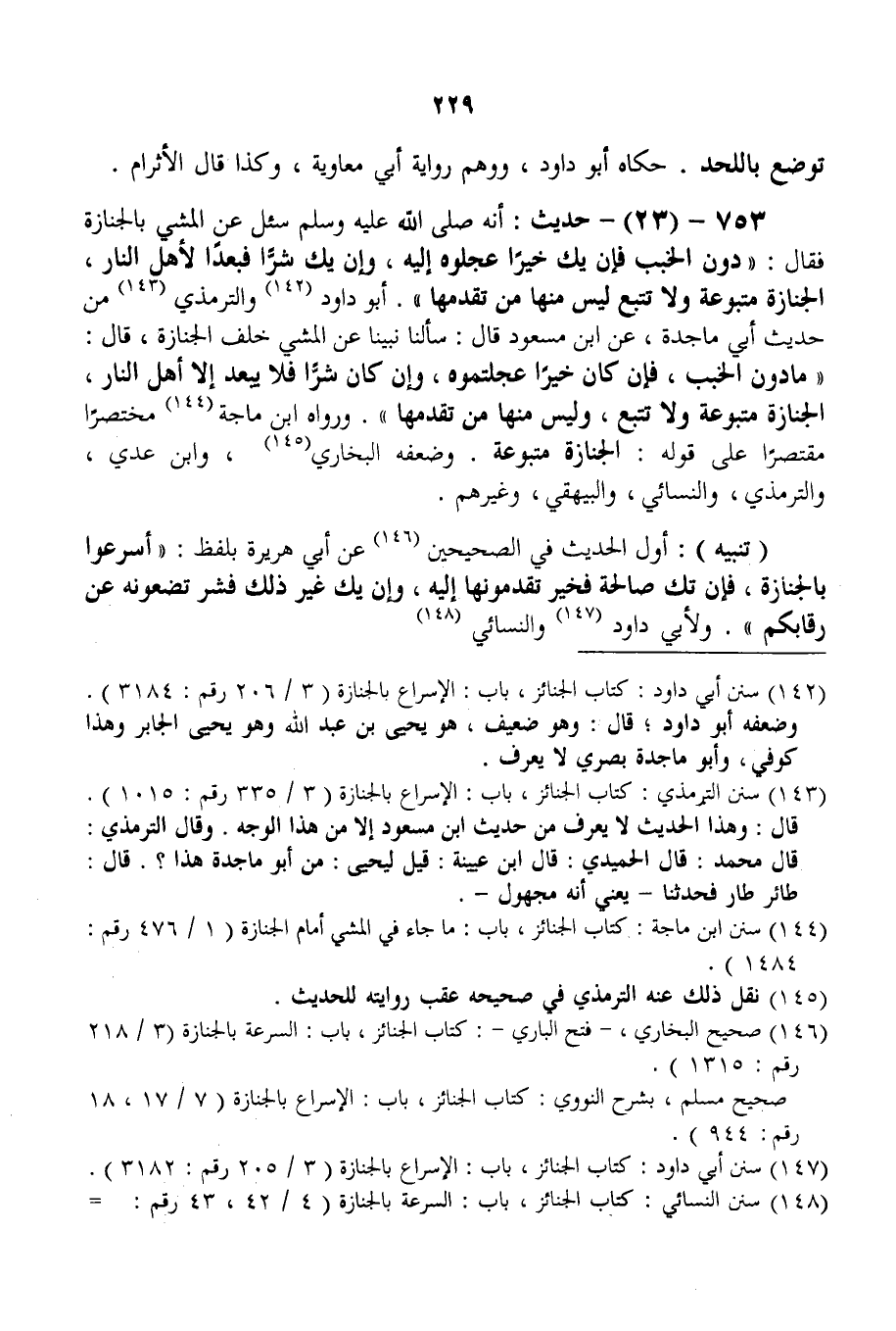 753 - (23) - حَدِيثُ: «أَنَّهُ - صَلَّى اللَّهُ عَلَيْهِ وَسَلَّمَ - سُئِلَ عَنْ الْمَشْيِ بِالْجِنَازَةِ فَقَالَ: دُونَ الْخَبَبِ فَإِنْ يَكُ خَيْرًا عَجِّلُوهُ إلَيْهِ، وَإِنْ يَكُ شَرًّا فَبُعْدًا لِأَهْلِ النَّارِ، الْجِنَازَةُ مَتْبُوعَةٌ وَلَا تَتْبَعُ لَيْسَ مِنْهَا مَنْ تَقَدَّمَهَا» أَبُو دَاوُد وَالتِّرْمِذِيُّ مِنْ حَدِيثِ أَبِي مَاجِدَةَ، عَنْ ابْنِ مَسْعُودٍ قَالَ: «سَأَلْنَا نَبِيَّنَا عَنْ الْمَشْيِ خَلْفَ الْجِنَازَةِ، قَالَ: مَا دُونَ الْخَبَبِ، فَإِنْ كَانَ خَيْرًا عَجَّلْتُمُوهُ، وَإِنْ كَانَ شَرًّا فَلَا يَبْعُدُ إلَّا أَهْلُ النَّارِ، الْجِنَازَةُ مَتْبُوعَةٌ وَلَا تَتْبَعُ، وَلَيْسَ مِنْهَا مَنْ تَقَدَّمَهَا» . وَرَوَاهُ ابْنُ مَاجَهْ مُخْتَصَرًا مُقْتَصِرًا عَلَى قَوْلِهِ: الْجِنَازَةُ مَتْبُوعَةٌ. وَضَعَّفَهُ الْبُخَارِيُّ، وَابْنُ عَدِيٍّ، وَالتِّرْمِذِيُّ، وَالنَّسَائِيُّ، وَالْبَيْهَقِيُّ، وَغَيْرُهُمْ.