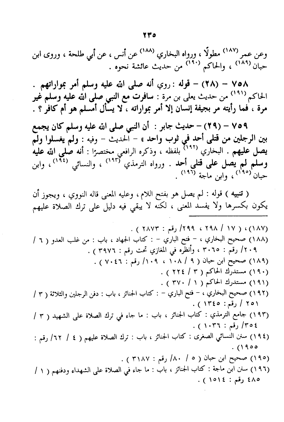 759 - (29) - حَدِيثُ جَابِرٍ: «أَنَّ النَّبِيَّ - صَلَّى اللَّهُ عَلَيْهِ وَسَلَّمَ - كَانَ يَجْمَعُ بَيْنَ الرَّجُلَيْنِ مِنْ قَتْلَى أُحُدٍ فِي ثَوْبٍ وَاحِدٍ» - الْحَدِيثَ - وَفِيهِ: وَلَمْ يُغَسَّلُوا وَلَمْ يُصَلَّ عَلَيْهِمْ. الْبُخَارِيُّ بِلَفْظِهِ، وَذَكَرَهُ الرَّافِعِيُّ مُخْتَصَرًا: «أَنَّهُ - صَلَّى اللَّهُ عَلَيْهِ وَسَلَّمَ - لَمْ يُصَلِّ عَلَى قَتْلَى أُحُدٍ» . وَرَوَاهُ التِّرْمِذِيُّ، وَالنَّسَائِيُّ، وَابْنُ حِبَّانَ، وَابْنُ مَاجَهْ. (تَنْبِيهٌ) قَوْلُهُ: لَمْ يُصَلَّ هُوَ بِفَتْحِ اللَّامِ، وَعَلَيْهِ الْمَعْنَى قَالَهُ النَّوَوِيُّ، وَيَجُوزُ أَنْ يَكُونَ بِكَسْرِهَا وَلَا يَفْسُدُ الْمَعْنَى، لَكِنَّهُ لَا يَبْقَى فِيهِ دَلِيلٌ عَلَى تَرْكِ الصَّلَاةِ عَلَيْهِمْ