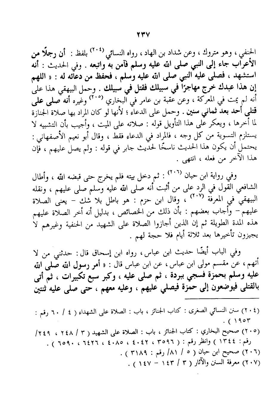 وَفِي رِوَايَةِ ابْنِ حِبَّانَ: ثُمَّ دَخَلَ بَيْتَهُ فَلَمْ يَخْرُجْ حَتَّى قَبَضَهُ اللَّهُ، وَأَطَالَ الشَّافِعِيُّ الْقَوْلَ فِي الرَّدِّ عَلَى مَنْ أَثْبَتَ أَنَّهُ - صَلَّى اللَّهُ عَلَيْهِ وَسَلَّمَ - صَلَّى عَلَيْهِمْ، وَنَقَلَهُ الْبَيْهَقِيُّ فِي الْمَعْرِفَةِ، وَقَالَ ابْنُ حَزْمٍ: هُوَ بَاطِلٌ بِلَا شَكٍّ - يَعْنِي الصَّلَاةَ عَلَيْهِمْ - وَأَجَابَ بَعْضُهُمْ: بِأَنَّ ذَلِكَ مِنْ الْخَصَائِصِ، بِدَلِيلِ أَنَّهُ أَخَّرَ الصَّلَاةَ عَلَيْهِمْ هَذِهِ الْمُدَّةَ الطَّوِيلَةَ ثُمَّ إنَّ الَّذِينَ أَجَازُوا الصَّلَاةَ عَلَى الشَّهِيدِ مِنْ الْحَنَفِيَّةِ وَغَيْرِهِمْ لَا يُجِيزُونَ تَأْخِيرَهَا بَعْدَ ثَلَاثَةِ أَيَّامٍ فَلَا حُجَّةَ لَهُمْ.