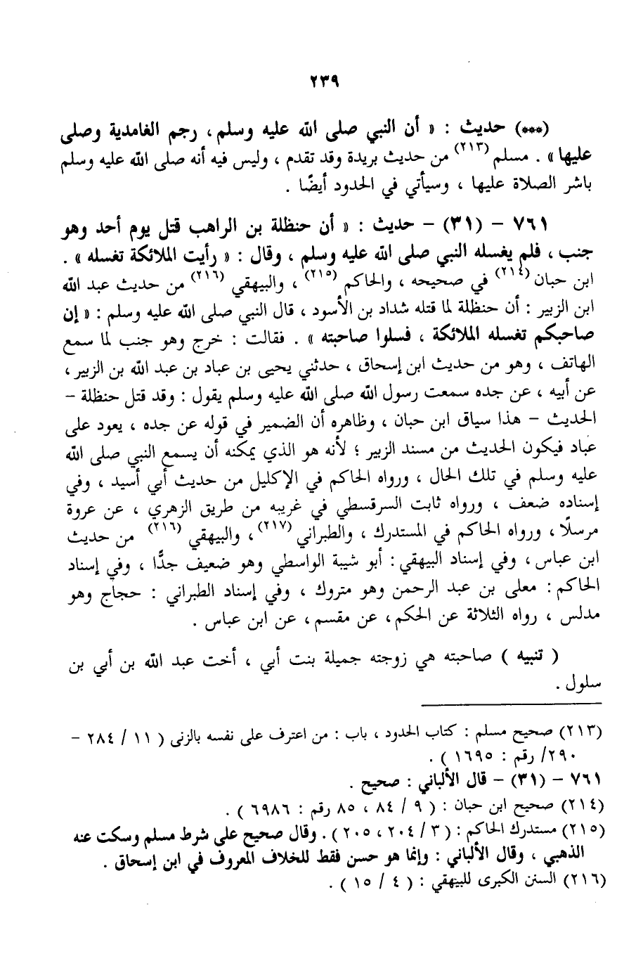 761 - (31) - حَدِيثُ: «أَنَّ حَنْظَلَةَ بْنَ الرَّاهِبِ قُتِلَ يَوْمَ أُحُدٍ وَهُوَ جُنُبٌ، فَلَمْ يُغَسِّلْهُ النَّبِيُّ - صَلَّى اللَّهُ عَلَيْهِ وَسَلَّمَ -، وَقَالَ: رَأَيْتُ الْمَلَائِكَةَ تُغَسِّلُهُ» ابْنُ حِبَّانَ فِي صَحِيحِهِ، وَالْحَاكِمُ، وَالْبَيْهَقِيُّ مِنْ حَدِيثِ عَبْدِ اللَّهِ بْنِ الزُّبَيْرِ: «أَنَّ حَنْظَلَةَ لَمَّا قَتَلَهُ شَدَّادُ بْنُ الْأَسْوَدِ، قَالَ النَّبِيُّ - صَلَّى اللَّهُ عَلَيْهِ وَسَلَّمَ -: إنَّ صَاحِبَكُمْ تُغَسِّلُهُ الْمَلَائِكَةُ، فَسَلُوا صَاحِبَتَهُ. فَقَالَتْ: خَرَجَ وَهُوَ جُنُبٌ لَمَّا سَمِعَ الْهَاتِفَ» ، وَهُوَ مِنْ حَدِيثِ ابْنِ إِسْحَاقَ، حَدَّثَنِي يَحْيَى بْنُ عَبَّادِ بْنِ عَبْدِ اللَّهِ بْنِ الزُّبَيْرِ، عَنْ أَبِيهِ، عَنْ جَدِّهِ «سَمِعْتُ رَسُولَ اللَّهِ - صَلَّى اللَّهُ عَلَيْهِ وَسَلَّمَ - يَقُولُ: وَقَدْ قُتِلَ حَنْظَلَةُ» - الْحَدِيثَ - هَذَا سِيَاقُ ابْنِ حِبَّانَ، وَظَاهِرُهُ أَنَّ الضَّمِيرَ فِي قَوْلِهِ عَنْ جَدِّهِ، يَعُودُ عَلَى عَبَّادٍ فَيَكُونُ الْحَدِيثُ مِنْ مُسْنَدِ الزُّبَيْرِ؛ لِأَنَّهُ هُوَ الَّذِي يُمْكِنُهُ أَنْ يَسْمَعَ النَّبِيَّ - صَلَّى اللَّهُ عَلَيْهِ وَسَلَّمَ - فِي تِلْكَ الْحَالِ، وَرَوَاهُ الْحَاكِمُ فِي الْإِكْلِيلِ مِنْ حَدِيثِ أَبِي أُسَيْدٍ، وَفِي إسْنَادِهِ ضَعْفٌ، وَرَوَاهُ ثَابِتٌ السَّرَقُسْطِيُّ فِي غَرِيبِهِ مِنْ طَرِيقِ الزُّهْرِيِّ، عَنْ عُرْوَةَ مُرْسَلًا، وَرَوَاهُ الْحَاكِمُ فِي الْمُسْتَدْرَكِ، وَالطَّبَرَانِيُّ، وَالْبَيْهَقِيُّ مِنْ حَدِيثِ ابْنِ عَبَّاسٍ، وَفِي إسْنَادِ الْبَيْهَقِيّ: أَبُو شَيْبَةَ الْوَاسِطِيُّ وَهُوَ ضَعِيفٌ جِدًّا، وَفِي إسْنَادِ الْحَاكِمِ: مُعَلَّى بْنُ عَبْدِ الرَّحْمَنِ وَهُوَ مَتْرُوكٌ، وَفِي إسْنَادِ الطَّبَرَانِيِّ: حَجَّاجٌ وَهُوَ مُدَلِّسٌ، رَوَاهُ الثَّلَاثَةُ عَنْ الْحَكَمِ، عَنْ مِقْسَمٍ، عَنْ ابْنِ عَبَّاسٍ. (تَنْبِيهٌ)