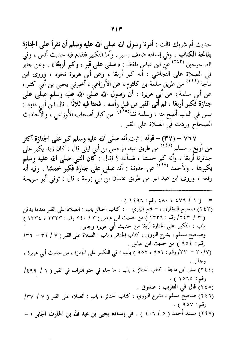 767 - (37) - قَوْلُهُ: ثَبَتَ «أَنَّهُ - صَلَّى اللَّهُ عَلَيْهِ وَسَلَّمَ - كَبَّرَ عَلَى الْجِنَازَةِ أَكْثَرَ مِنْ أَرْبَعٍ» . مُسْلِمٌ مِنْ طَرِيقِ عَبْدِ الرَّحْمَنِ بْنِ أَبِي لَيْلَى قَالَ: «كَانَ زَيْدٌ يُكَبِّرُ عَلَى جَنَائِزِنَا أَرْبَعًا، وَأَنَّهُ كَبَّرَ خَمْسًا، فَسَأَلْتُهُ؟ فَقَالَ: كَانَ النَّبِيُّ - صَلَّى اللَّهُ عَلَيْهِ وَسَلَّمَ - يُكَبِّرُهَا» وَلِأَحْمَدَ عَنْ حُذَيْفَةَ: «أَنَّهُ صَلَّى عَلَى جِنَازَةٍ فَكَبَّرَ خَمْسًا» وَفِيهِ أَنَّهُ رَفَعَهُ.