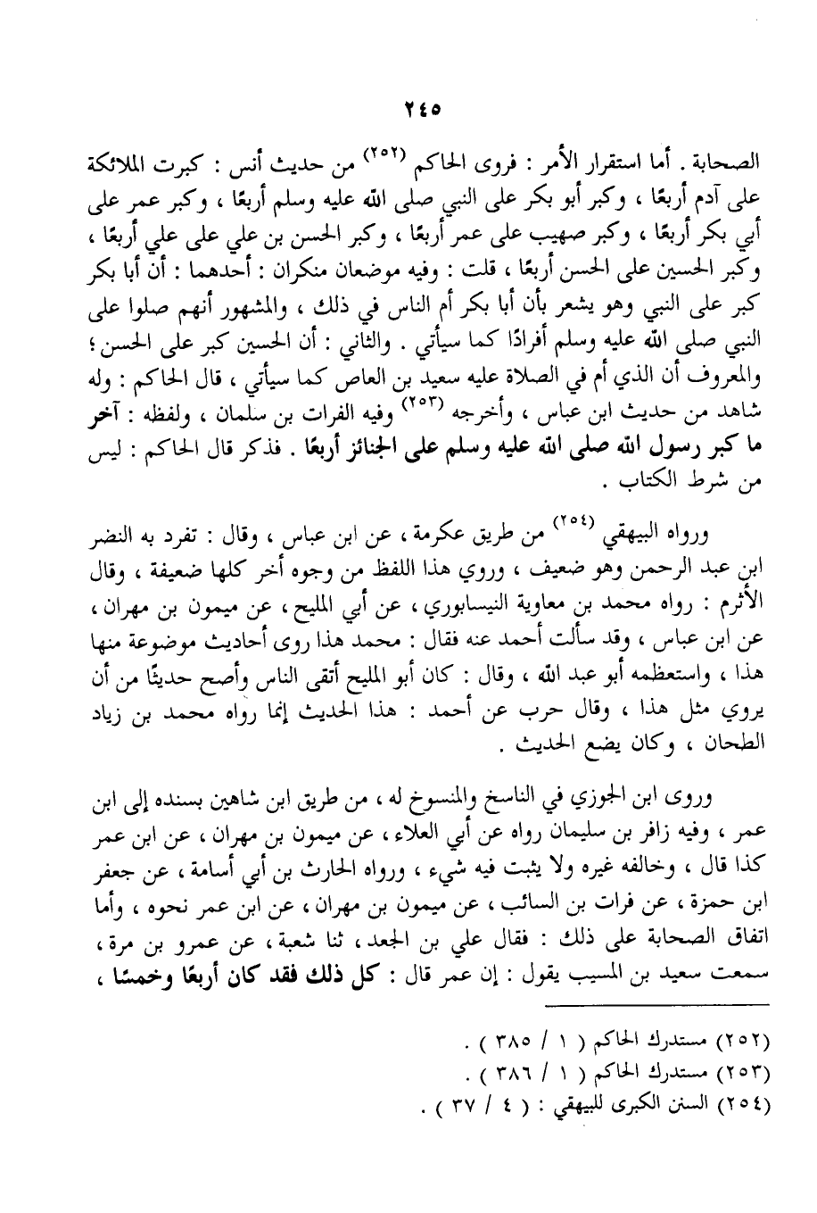 وَرَوَى ابْنُ الْجَوْزِيِّ فِي النَّاسِخِ وَالْمَنْسُوخِ لَهُ، مِنْ طَرِيقِ ابْنِ شَاهِينَ بِسَنَدِهِ إلَى ابْنِ عُمَرَ، وَفِيهِ زَافِرُ بْنُ سُلَيْمَانَ رَوَاهُ عَنْ أَبِي الْعَلَاءِ، عَنْ مَيْمُونِ بْنِ مِهْرَانَ، عَنْ ابْنِ عُمَرَ كَذَا قَالَ، وَخَالَفَهُ غَيْرُهُ وَلَا يَثْبُتُ فِيهِ شَيْءٌ، وَرَوَاهُ الْحَارِثُ بْنُ أَبِي أُسَامَةَ، عَنْ جَعْفَرِ بْنِ حَمْزَةَ، عَنْ فُرَاتِ بْنِ السَّائِبِ، عَنْ مَيْمُونِ بْنِ مِهْرَانَ، عَنْ ابْنِ عُمَرَ نَحْوَهُ، وَأَمَّا اتِّفَاقُ الصَّحَابَةِ عَلَى ذَلِكَ: فَقَالَ عَلِيُّ بْنُ الْجَعْدِ: ثَنَا شُعْبَةُ، عَنْ عَمْرِو بْنِ مُرَّةَ، سَمِعْت سَعِيدَ بْنَ الْمُسَيِّبِ يَقُولُ: إنَّ عُمَرَ قَالَ: كُلُّ ذَلِكَ فَقَدْ كَانَ أَرْبَعًا وَخَمْسًا،