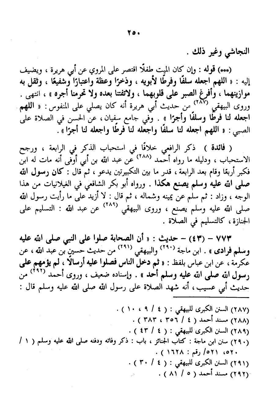 773 - (43) - حَدِيثُ: «أَنَّ الصَّحَابَةَ صَلَّوْا عَلَى النَّبِيِّ - صَلَّى اللَّهُ عَلَيْهِ وَسَلَّمَ - وَسَلَّمَ فُرَادَى» ابْنُ مَاجَهْ وَالْبَيْهَقِيُّ مِنْ حَدِيثِ حُسَيْنٍ بْنِ عَبْدِ اللَّهِ، عَنْ عِكْرِمَةَ، عَنْ ابْنِ عَبَّاسٍ بِلَفْظِ: «ثُمَّ دَخَلَ النَّاسُ فَصَلُّوا عَلَيْهِ أَرْسَالًا، لَمْ يَؤُمَّهُمْ عَلَى رَسُولِ اللَّهِ - صَلَّى اللَّهُ عَلَيْهِ وَسَلَّمَ - أَحَدٌ» . وَإِسْنَادُهُ ضَعِيفٌ.