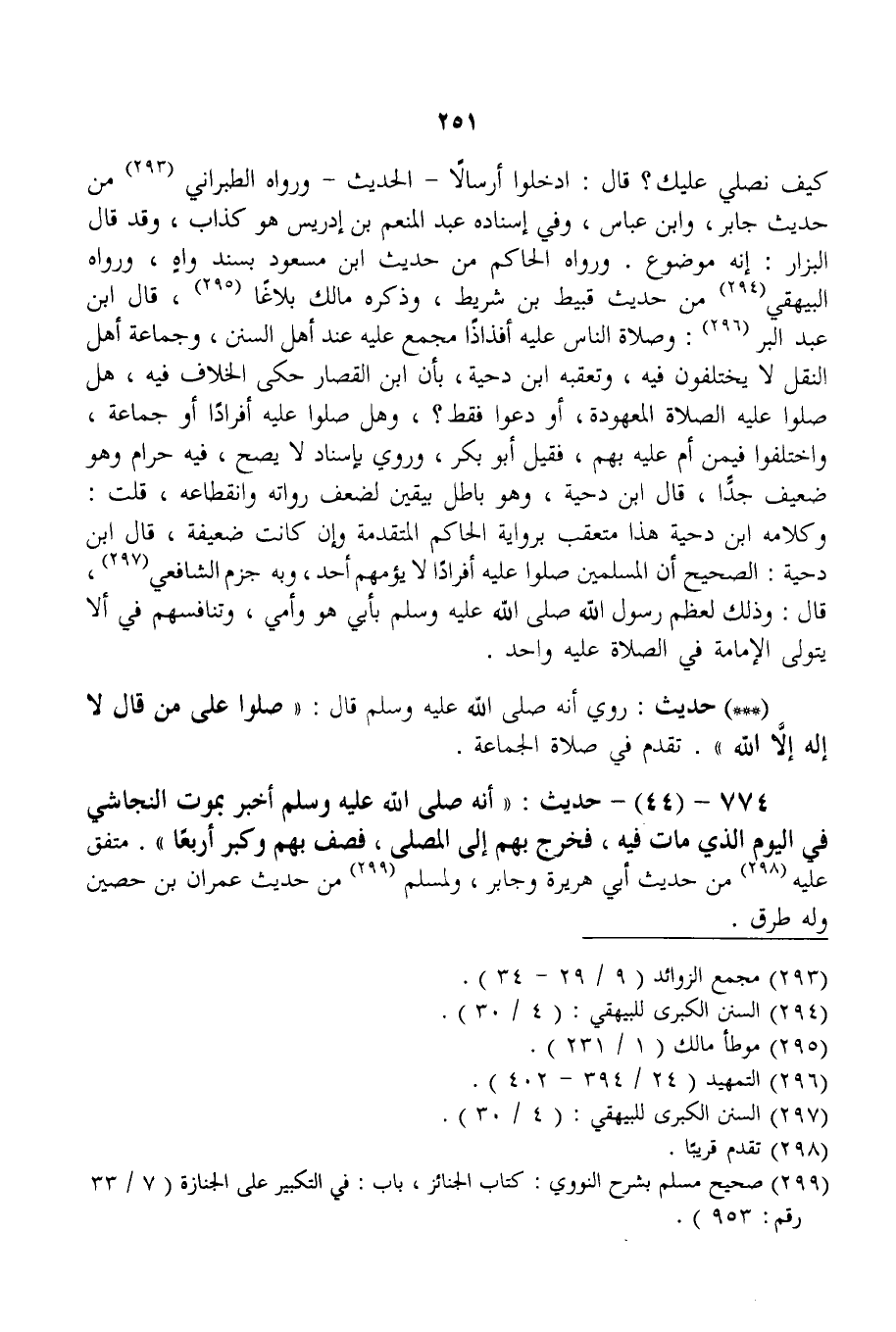 كَيْفَ نُصَلِّي عَلَيْك؟ قَالَ: اُدْخُلُوا أَرْسَالًا -» الْحَدِيثَ - وَرَوَاهُ الطَّبَرَانِيُّ مِنْ حَدِيثِ جَابِرٍ، وَابْنِ عَبَّاسٍ، وَفِي إسْنَادِهِ عَبْدُ الْمُنْعِمِ بْنُ إدْرِيسَ هُوَ كَذَّابٌ، وَقَدْ قَالَ الْبَزَّارُ: إنَّهُ مَوْضُوعٌ. وَرَوَاهُ الْحَاكِمُ مِنْ حَدِيثِ ابْنِ مَسْعُودٍ بِسَنَدٍ وَاهٍ، وَرَوَاهُ الْبَيْهَقِيُّ مِنْ حَدِيثِ نُبَيْطِ بْنِ شَرِيطٍ، وَذَكَرَهُ مَالِكٌ بَلَاغًا، قَالَ ابْنُ عَبْدِ الْبَرِّ: وَصَلَاةُ النَّاسِ عَلَيْهِ أَفْذَاذًا مُجْمَعٌ عَلَيْهِ عِنْدَ أَهْلِ السُّنَنِ، وَجَمَاعَةُ أَهْلِ النَّقْلِ لَا يَخْتَلِفُونَ فِيهِ، وَتَعَقَّبَهُ ابْنُ دِحْيَةَ، بِأَنَّ ابْنَ الْقَصَّارِ حَكَى الْخِلَافَ فِيهِ، هَلْ صَلُّوا عَلَيْهِ الصَّلَاةَ الْمَعْهُودَةَ، أَوْ دَعَوْا فَقَطْ؟ ، وَهَلْ صَلُّوا عَلَيْهِ أَفْرَادًا أَوْ جَمَاعَةً، وَاخْتَلَفُوا فِيمَنْ أَمَّ عَلَيْهِ بِهِمْ، فَقِيلَ أَبُو بَكْرٍ، وَرُوِيَ بِإِسْنَادٍ لَا يَصِحُّ، فِيهِ حَرَامٌ وَهُوَ ضَعِيفٌ جِدًّا، قَالَ ابْنُ دِحْيَةَ، وَهُوَ بَاطِلٌ بِيَقِينٍ لِضَعْفِ رُوَاتِهِ وَانْقِطَاعِهِ، قُلْتُ: وَكَلَامُ ابْنِ دِحْيَةَ هَذَا مُتَعَقَّبٌ بِرِوَايَةِ الْحَاكِمِ الْمُتَقَدِّمَةِ وَإِنْ كَانَتْ ضَعِيفَةً، قَالَ ابْنُ دِحْيَةَ: الصَّحِيحُ أَنَّ الْمُسْلِمِينَ صَلَّوْا عَلَيْهِ أَفْرَادًا لَا يَؤُمُّهُمْ أَحَدٌ، وَبِهِ جَزَمَ الشَّافِعِيُّ، قَالَ: وَذَلِكَ لِعِظَمِ رَسُولِ اللَّهِ - صَلَّى اللَّهُ عَلَيْهِ وَسَلَّمَ - بِأَبِي هُوَ وَأُمِّي، وَتَنَافُسِهِمْ فِي أَلَّا يَتَوَلَّى الْإِمَامَةَ فِي الصَّلَاةِ عَلَيْهِ وَاحِدٌ.