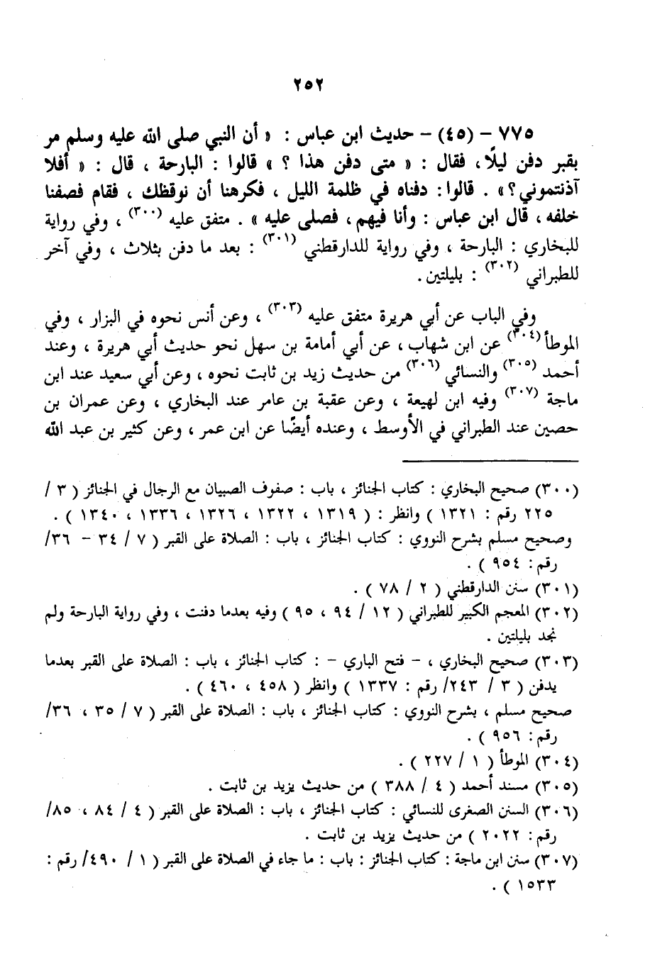 حَدِيثُ ابْنِ عَبَّاسٍ: «أَنَّ النَّبِيَّ - صَلَّى اللَّهُ عَلَيْهِ وَسَلَّمَ - مَرَّ بِقَبْرٍ دُفِنَ لَيْلًا، فَقَالَ: مَتَى دُفِنَ هَذَا؟ قَالُوا: الْبَارِحَةَ، قَالَ: أَفَلَا آذَنْتُمُونِي؟ . قَالُوا: دَفَنَّاهُ فِي ظُلْمَةِ اللَّيْلِ، فَكَرِهْنَا أَنْ نُوقِظَك، فَقَامَ فَصَفَّنَا خَلْفَهُ، قَالَ ابْنُ عَبَّاسٍ: وَأَنَا فِيهِمْ، فَصَلَّى عَلَيْهِ» . مُتَّفَقٌ عَلَيْهِ، وَفِي رِوَايَةٍ لِلْبُخَارِيِّ: الْبَارِحَةَ، وَفِي رِوَايَةٍ لِلدَّارَقُطْنِيِّ: بَعْدَ مَا دُفِنَ بِثَلَاثٍ، وَفِي آخَرَ لِلطَّبَرَانِيِّ: بِلَيْلَتَيْنِ.