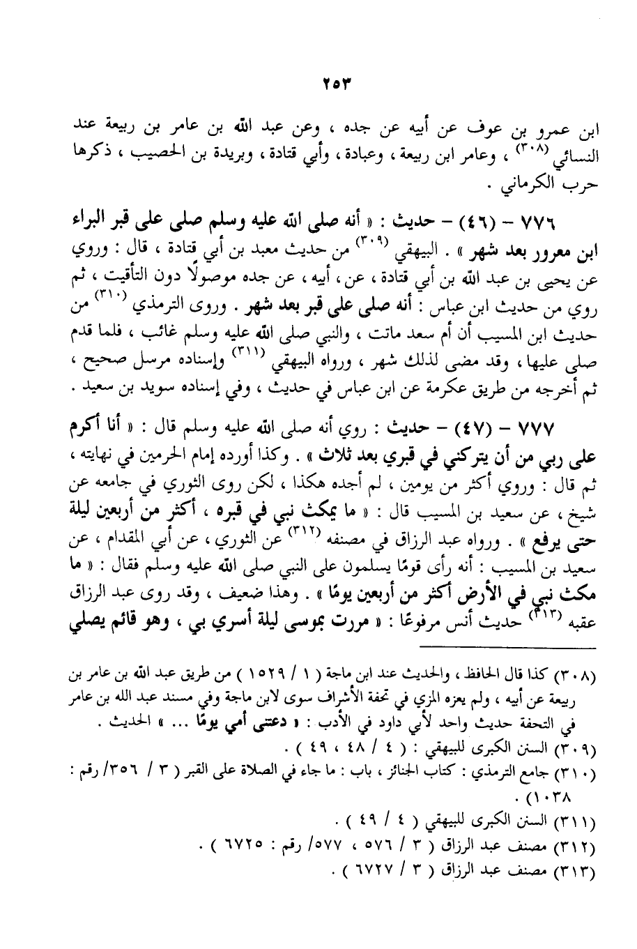 776 - (46) - حَدِيثُ: «أَنَّهُ - صَلَّى اللَّهُ عَلَيْهِ وَسَلَّمَ - صَلَّى عَلَى قَبْرِ الْبَرَاءِ بْنِ مَعْرُورٍ بَعْدَ شَهْرٍ» الْبَيْهَقِيُّ مِنْ حَدِيثِ مَعْبَدِ بْنِ أَبِي قَتَادَةَ، قَالَ: وَرُوِيَ عَنْ يَحْيَى بْنِ عَبْدِ اللَّهِ بْنِ أَبِي قَتَادَةَ، عَنْ، أَبِيهِ، عَنْ جَدِّهِ مَوْصُولًا دُونَ التَّأْقِيتِ، ثُمَّ رُوِيَ مِنْ حَدِيثِ ابْنِ عَبَّاسٍ: «أَنَّهُ صَلَّى عَلَى قَبْرٍ بَعْدَ شَهْرٍ» . وَرَوَى التِّرْمِذِيُّ مِنْ حَدِيثِ ابْنِ الْمُسَيِّبِ «أَنَّ أُمَّ سَعْدٍ مَاتَتْ، وَالنَّبِيُّ - صَلَّى اللَّهُ عَلَيْهِ وَسَلَّمَ - غَائِبٌ، فَلَمَّا قَدِمَ صَلَّى عَلَيْهَا، وَقَدْ مَضَى لِذَلِكَ شَهْرٌ» ، وَرَوَاهُ الْبَيْهَقِيُّ وَإِسْنَادُهُ مُرْسَلٌ صَحِيحٌ، ثُمَّ أَخْرَجَهُ مِنْ طَرِيقِ عِكْرِمَةَ عَنْ ابْنِ عَبَّاسٍ فِي حَدِيثٍ، وَفِي إسْنَادِهِ سُوَيْد بْنُ سَعِيدٍ.