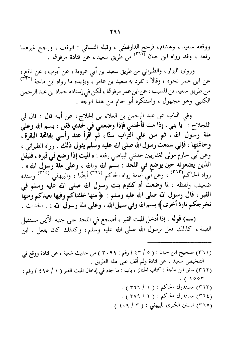 وَفِي الْبَابِ عَنْ عَبْدِ الرَّحْمَنِ بْنِ الْعَلَاءِ بْنِ الْحَلَّاجِ، عَنْ أَبِيهِ قَالَ: «قَالَ لِي الْحَلَّاجُ: يَا بُنَيَّ، إذَا مِتُّ فَأَلْحِدْنِي فَإِذَا وَضَعْتنِي فِي لَحْدِي فَقُلْ: بِسْمِ اللَّهِ وَعَلَى مِلَّةِ رَسُولِ اللَّهِ، ثُمَّ سُنَّ عَلَيَّ التُّرَابَ سَنًّا، ثُمَّ اقْرَأْ عِنْدَ رَأْسِي بِفَاتِحَةِ الْبَقَرَةِ، وَخَاتِمَتِهَا، فَإِنِّي سَمِعْت رَسُولَ اللَّهِ - صَلَّى اللَّهُ عَلَيْهِ وَسَلَّمَ - يَقُولُ ذَلِكَ» . رَوَاهُ الطَّبَرَانِيُّ، وَعَنْ أَبِي حَازِمٍ مَوْلَى الْغِفَارِيِّينَ حَدَّثَنِي الْبَيَاضِيُّ رَفَعَهُ: «الْمَيِّتُ إذَا وُضِعَ فِي قَبْرِهِ، فَلْيَقُلْ الَّذِينَ يَضَعُونَهُ حِينَ يُوضَعُ فِي اللَّحْدِ: بِسْمِ اللَّهِ وَبِاَللَّهِ، وَعَلَى مِلَّةِ رَسُولِ اللَّهِ» . رَوَاهُ الْحَاكِمُ، وَعَنْ أَبِي أُمَامَةَ رَوَاهُ الْحَاكِمُ أَيْضًا، وَالْبَيْهَقِيُّ وَسَنَدُهُ ضَعِيفٌ وَلَفْظُهُ: «لَمَّا وُضِعَتْ أُمُّ كُلْثُومٍ بِنْتُ رَسُولِ اللَّهِ - صَلَّى اللَّهُ عَلَيْهِ وَسَلَّمَ - فِي الْقَبْرِ، قَالَ رَسُولُ اللَّهِ - صَلَّى اللَّهُ عَلَيْهِ وَسَلَّمَ -: {مِنْهَا خَلَقْنَاكُمْ وَفِيهَا نُعِيدُكُمْ وَمِنْهَا نُخْرِجُكُمْ تَارَةً أُخْرَى} [طه: 55] بِسْمِ اللَّهِ وَفِي سَبِيلِ اللَّهِ، وَعَلَى مِلَّةِ رَسُولِ اللَّهِ» . الْحَدِيثَ.