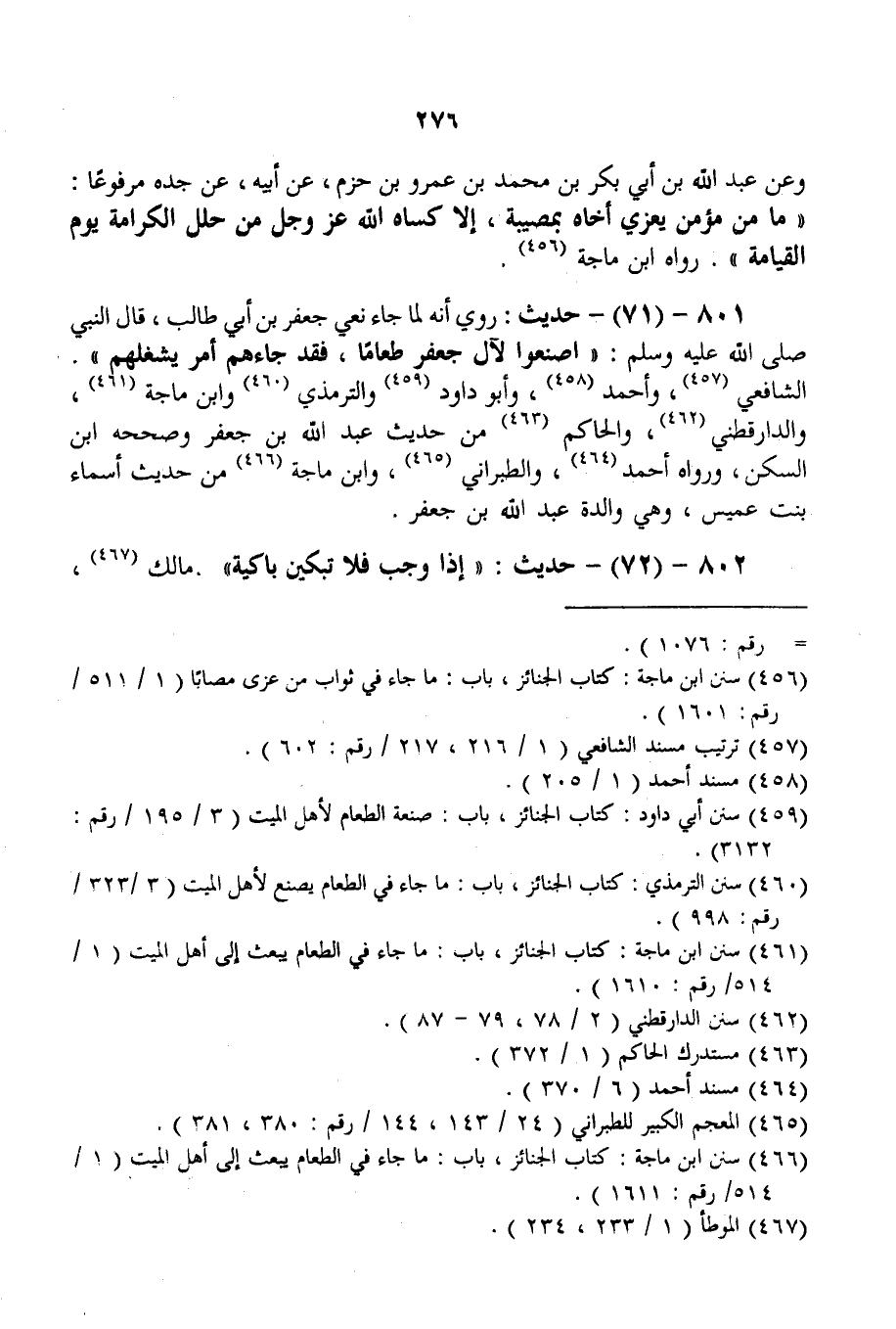 801 - (71) - حَدِيثُ: رُوِيَ أَنَّهُ لَمَّا جَاءَ نَعْيُ جَعْفَرِ بْنِ أَبِي طَالِبٍ، قَالَ النَّبِيُّ - صَلَّى اللَّهُ عَلَيْهِ وَسَلَّمَ -: «اصْنَعُوا لِآلِ جَعْفَرٍ طَعَامًا، فَقَدْ جَاءَهُمْ أَمْرٌ يَشْغَلُهُمْ» . الشَّافِعِيُّ، وَأَحْمَدُ، وَأَبُو دَاوُد وَالتِّرْمِذِيُّ وَابْنُ مَاجَهْ، وَالدَّارَقُطْنِيّ، وَالْحَاكِمُ مِنْ حَدِيثِ عَبْدِ اللَّهِ بْنِ جَعْفَرٍ وَصَحَّحَهُ ابْنُ السَّكَنِ، وَرَوَاهُ أَحْمَدُ، وَالطَّبَرَانِيُّ، وَابْنُ مَاجَهْ مِنْ حَدِيثِ أَسْمَاءَ بِنْتِ عُمَيْسٍ، وَهِيَ وَالِدَةُ عَبْدِ اللَّهِ بْنِ جَعْفَرٍ.