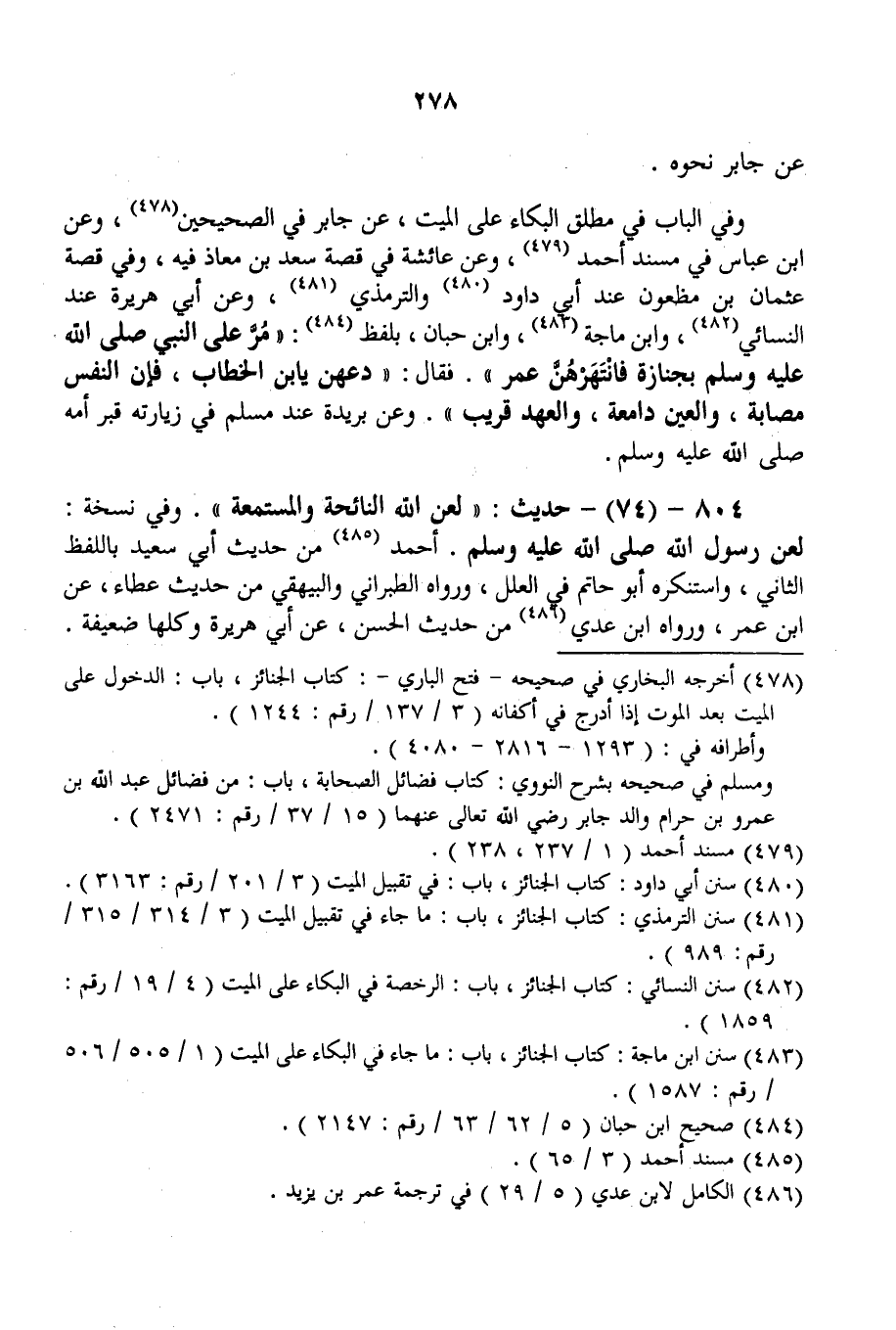 804 - (74) - حَدِيثُ: «لَعَنَ اللَّهُ النَّائِحَةَ وَالْمُسْتَمِعَةَ» . وَفِي نُسْخَةٍ: لَعَنَ رَسُولُ اللَّهِ - صَلَّى اللَّهُ عَلَيْهِ وَسَلَّمَ -. أَحْمَدُ مِنْ حَدِيثِ أَبِي سَعِيدٍ بِاللَّفْظِ الثَّانِي، وَاسْتَنْكَرَهُ أَبُو حَاتِمٍ فِي الْعِلَلِ، وَرَوَاهُ الطَّبَرَانِيُّ وَالْبَيْهَقِيُّ مِنْ حَدِيثِ عَطَاءٍ، عَنْ ابْنِ عُمَرَ، وَرَوَاهُ ابْنُ عَدِيٍّ مِنْ حَدِيثِ الْحَسَنِ، عَنْ أَبِي هُرَيْرَةَ وَكُلُّهَا ضَعِيفَةٌ.