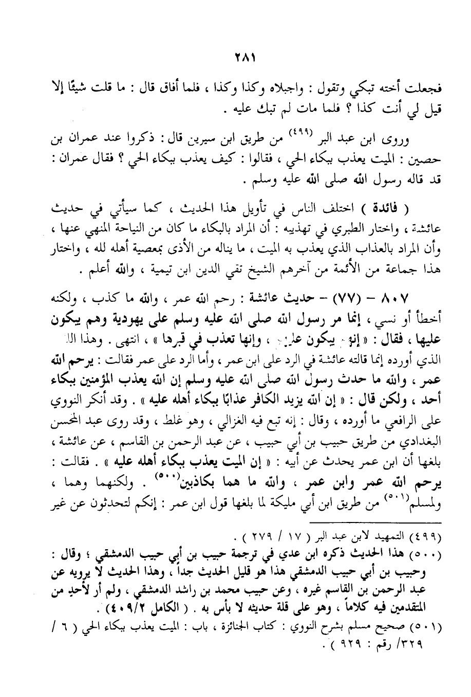 807 - (77) - حَدِيثُ عَائِشَةَ: «رَحِمَ اللَّهُ عُمَرَ، وَاَللَّهِ مَا كَذَبَ، وَلَكِنَّهُ أَخْطَأَ أَوْ نَسِيَ، إنَّمَا مَرَّ رَسُولُ اللَّهِ - صَلَّى اللَّهُ عَلَيْهِ وَسَلَّمَ - عَلَى يَهُودِيَّةٍ وَهُمْ يَبْكُونَ عَلَيْهَا، فَقَالَ: إنَّهُمْ يَبْكُونَ عَلَيْهِمْ، وَإِنَّهَا تُعَذَّبُ فِي قَبْرِهَا» ، انْتَهَى. وَهَذَا اللَّفْظُ الَّذِي أَوْرَدَهُ إنَّمَا قَالَتْهُ عَائِشَةُ فِي الرَّدِّ عَلَى ابْنِ عُمَرَ وَأَمَّا الرَّدُّ عَلَى عُمَرَ فَقَالَتْ: يَرْحَمُ اللَّهُ عُمَرَ، وَاَللَّهِ مَا حَدَّثَ رَسُولُ اللَّهِ - صَلَّى اللَّهُ عَلَيْهِ وَسَلَّمَ - إنَّ اللَّهَ يُعَذِّبُ الْمُؤْمِنِينَ بِبُكَاءِ أَحَدٍ، وَلَكِنْ قَالَ: «إنَّ اللَّهَ يَزِيدُ الْكَافِرَ عَذَابًا بِبُكَاءِ أَهْلِهِ عَلَيْهِ» . وَقَدْ أَنْكَرَ النَّوَوِيُّ عَلَى الرَّافِعِيِّ مَا أَوْرَدَهُ، وَقَالَ: إنَّهُ تَبِعَ فِيهِ الْغَزَالِيَّ، وَهُوَ غَلَطٌ، وَقَدْ رَوَى عَبْدُ الْمُحْسِنِ الْبَغْدَادِيُّ مِنْ طَرِيقِ حَبِيبِ بْنِ أَبِي حَبِيبٍ، عَنْ عَبْدِ الرَّحْمَنِ بْنِ الْقَاسِمِ، عَنْ عَائِشَةَ، بَلَغَهَا أَنَّ ابْنَ عُمَرَ يُحَدِّثُ عَنْ أَبِيهِ: «إنَّ الْمَيِّتَ يُعَذَّبُ بِبُكَاءِ أَهْلِهِ عَلَيْهِ. فَقَالَتْ: يَرْحَمُ اللَّهُ عُمَرَ وَابْنَ عُمَرَ، وَاَللَّهِ مَا هُمَا بِكَاذِبَيْنِ. وَلَكِنَّهُمَا وَهَمَا» ، وَلِمُسْلِمٍ مِنْ طَرِيقِ ابْنِ أَبِي مُلَيْكَةَ لَمَّا بَلَغَهَا قَوْلُ ابْنِ عُمَرَ: إنَّكُمْ لَتُحَدِّثُونَ عَنْ غَيْرِ