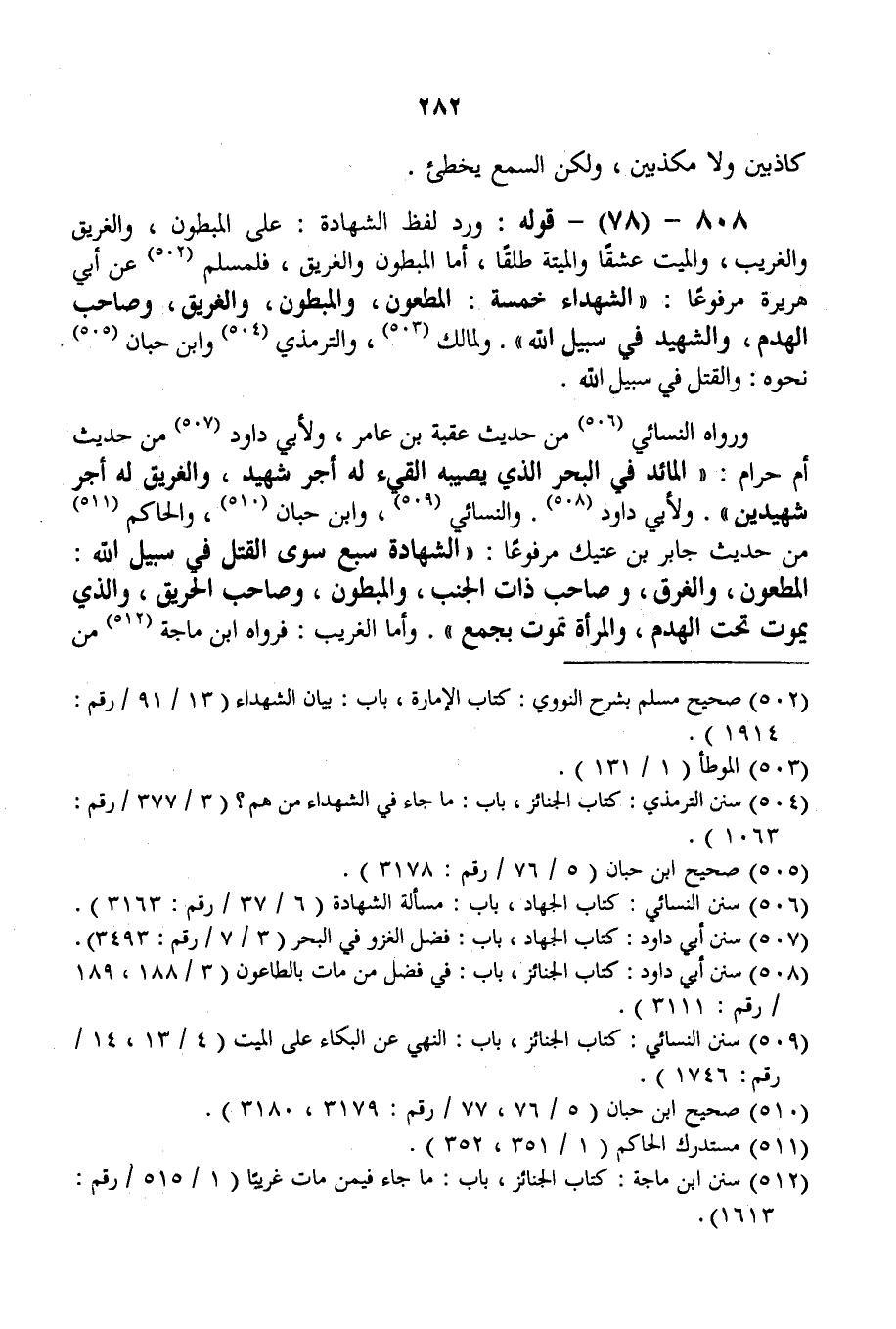 808 - (78) - قَوْلُهُ: وَرَدَ لَفْظُ الشَّهَادَةِ: عَلَى الْمَبْطُونِ، وَالْغَرِيقِ وَالْغَرِيبِ، وَالْمَيِّتِ عِشْقًا وَالْمَيِّتَةِ طَلْقًا، أَمَّا الْمَبْطُونُ وَالْغَرِيقُ، فَلِمُسْلِمٍ عَنْ أَبِي هُرَيْرَةَ مَرْفُوعًا: «الشُّهَدَاءُ خَمْسَةٌ: الْمَطْعُونُ، وَالْمَبْطُونُ، وَالْغَرِيقُ، وَصَاحِبُ الْهَدْمِ، وَالشَّهِيدُ فِي سَبِيلِ اللَّهِ» . وَلِمَالِكٍ، وَالتِّرْمِذِيِّ وَابْنِ حِبَّانَ نَحْوُهُ: وَالْقَتْلُ فِي سَبِيلِ اللَّهِ. وَرَوَاهُ النَّسَائِيُّ مِنْ حَدِيثِ عُقْبَةَ بْنِ عَامِرٍ، وَلِأَبِي دَاوُد مِنْ حَدِيثِ أُمِّ حَرَامٍ: «الْمَائِدُ فِي الْبَحْرِ الَّذِي يُصِيبُهُ الْقَيْءُ لَهُ أَجْرُ شَهِيدٍ، وَالْغَرِيقُ لَهُ أَجْرُ شَهِيدَيْنِ» . وَلِأَبِي دَاوُد. وَالنَّسَائِيُّ، وَابْنُ حِبَّانَ، وَالْحَاكِمُ مِنْ حَدِيثِ جَابِرِ بْنِ عَتِيكٍ مَرْفُوعًا: «الشَّهَادَةُ سَبْعٌ سِوَى الْقَتْلِ فِي سَبِيلِ اللَّهِ: الْمَطْعُونُ، وَالْغَرِقُ، وَصَاحِبُ ذَاتِ الْجَنْبِ، وَالْمَبْطُونُ، وَصَاحِبُ الْحَرِيقِ، وَاَلَّذِي يَمُوتُ تَحْتَ الْهَدْمِ، وَالْمَرْأَةُ تَمُوتُ بِجُمْعٍ» . وَأَمَّا الْغَرِيبُ: فَرَوَاهُ ابْنُ مَاجَهْ مِنْ