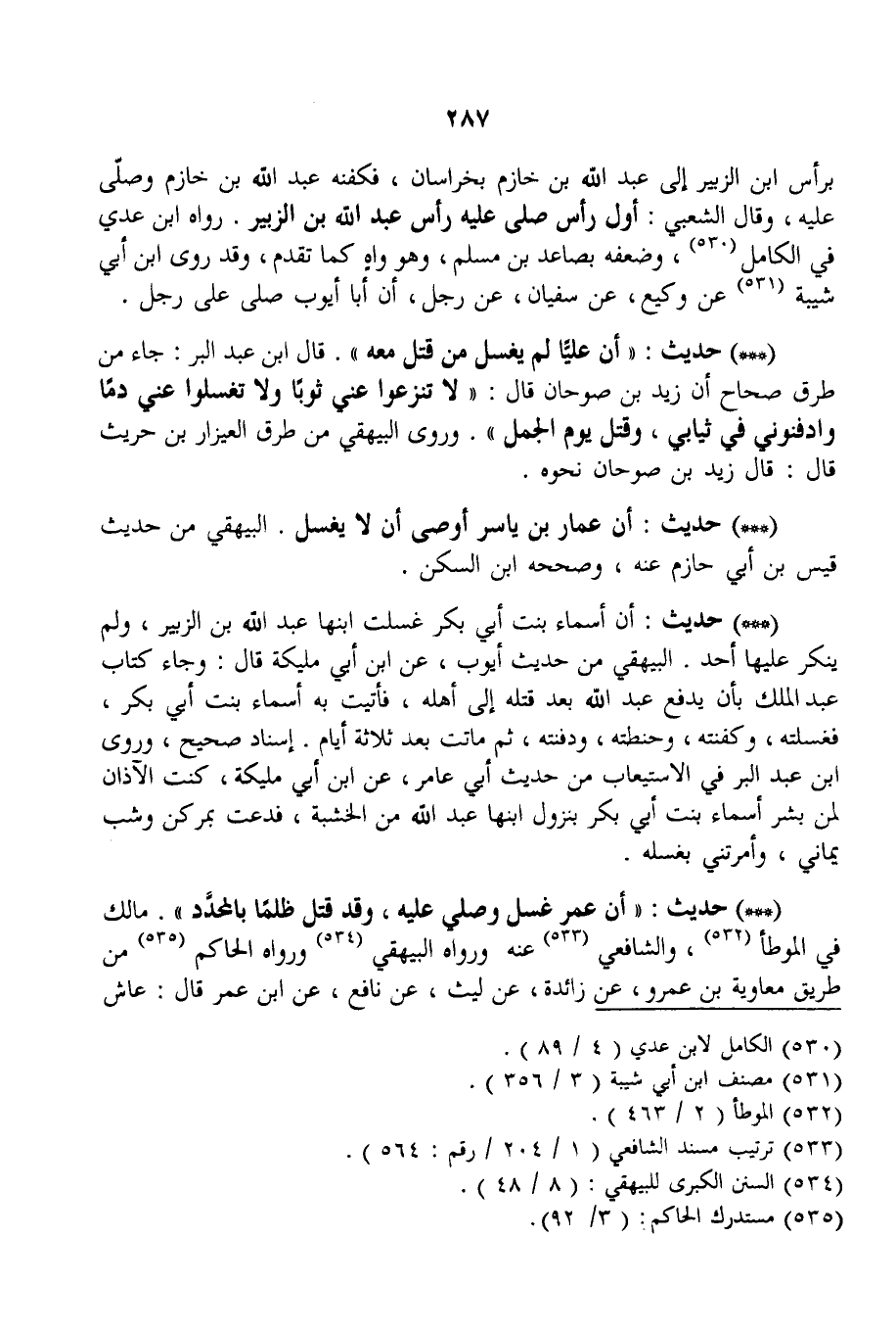 حَدِيثُ: " أَنَّ عُمَرَ غُسِّلَ وَصُلِّيَ عَلَيْهِ، وَقَدْ قُتِلَ ظُلْمًا بِالْمُحَدَّدِ ". مَالِكٌ فِي الْمُوَطَّأِ، وَالشَّافِعِيُّ عَنْهُ وَرَوَاهُ الْبَيْهَقِيُّ وَرَوَاهُ الْحَاكِمُ مِنْ طَرِيقِ مُعَاوِيَةَ بْنِ عَمْرٍو، عَنْ زَائِدَةَ، عَنْ لَيْثٍ، عَنْ نَافِعٍ، عَنْ ابْنِ عُمَرَ قَالَ: عَاشَ
