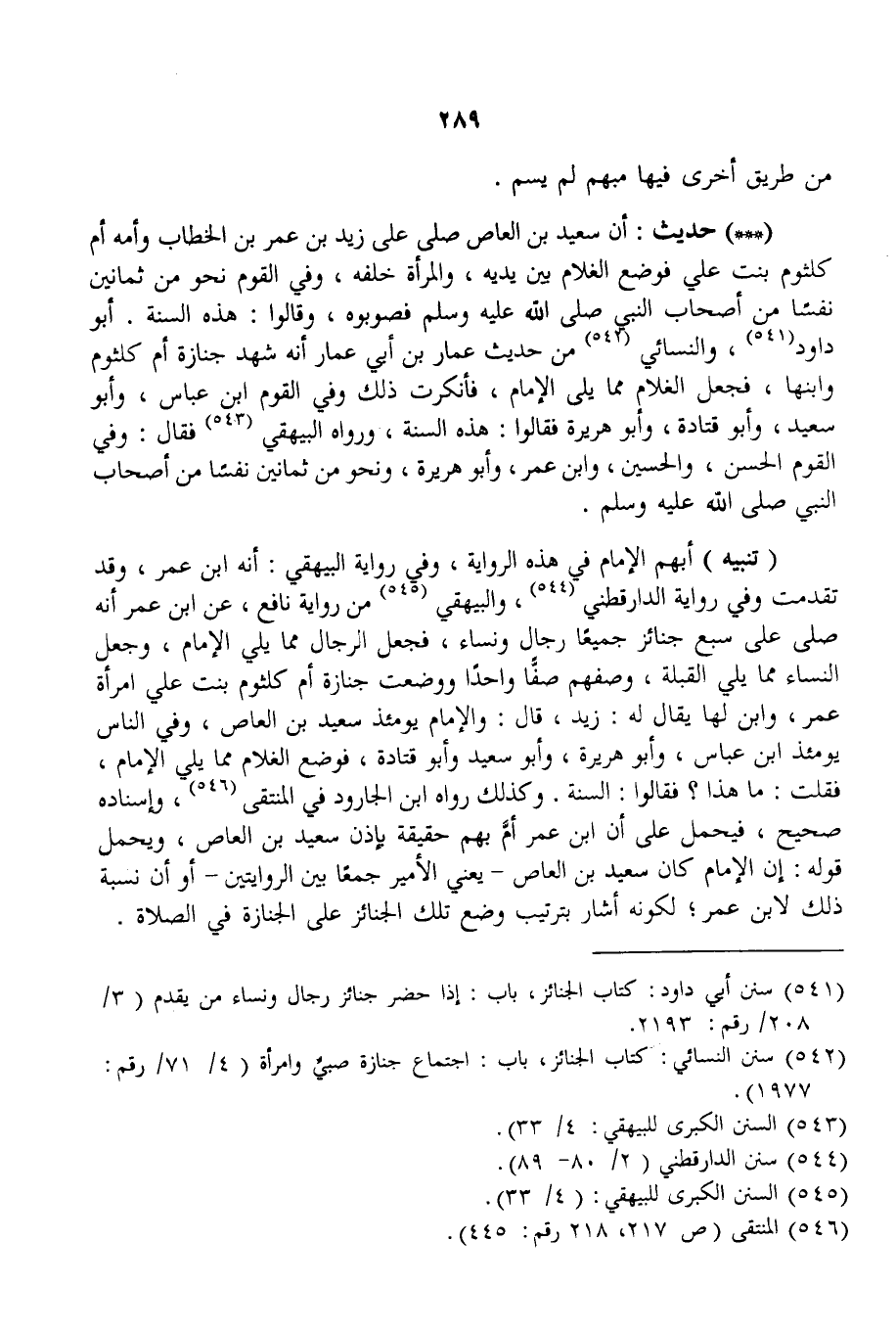 حَدِيثُ: أَنَّ سَعِيدَ بْنَ الْعَاصِ صَلَّى عَلَى زَيْدِ بْنِ عُمَرَ بْنِ الْخَطَّابِ وَأُمِّهِ أُمِّ كُلْثُومٍ بِنْتِ عَلِيٍّ فَوَضَعَ الْغُلَامَ بَيْنَ يَدَيْهِ، وَالْمَرْأَةَ خَلْفَهُ، وَفِي الْقَوْمِ نَحْوٌ مِنْ ثَمَانِينَ نَفْسًا مِنْ أَصْحَابِ النَّبِيِّ - صَلَّى اللَّهُ عَلَيْهِ وَسَلَّمَ - فَصَوَّبُوهُ، وَقَالُوا: هَذِهِ السُّنَّةُ. أَبُو دَاوُد، وَالنَّسَائِيُّ مِنْ حَدِيثِ عَمَّارِ بْنِ أَبِي عَمَّارِ أَنَّهُ شَهِدَ جِنَازَةَ أُمِّ كُلْثُومٍ وَابْنِهَا، فَجَعَلَ الْغُلَامَ مِمَّا يَلِي الْإِمَامَ، فَأَنْكَرْت ذَلِكَ وَفِي الْقَوْمِ ابْنُ عَبَّاسٍ، وَأَبُو سَعِيدٍ، وَأَبُو قَتَادَةَ، وَأَبُو هُرَيْرَةَ فَقَالُوا: هَذِهِ السُّنَّةُ، وَرَوَاهُ الْبَيْهَقِيُّ فَقَالَ: وَفِي الْقَوْمِ الْحَسَنُ، وَالْحُسَيْنُ، وَابْنُ عُمَرَ، وَأَبُو هُرَيْرَةَ، وَنَحْوٌ مِنْ ثَمَانِينَ نَفْسًا مِنْ أَصْحَابِ النَّبِيِّ - صَلَّى اللَّهُ عَلَيْهِ وَسَلَّمَ -.
