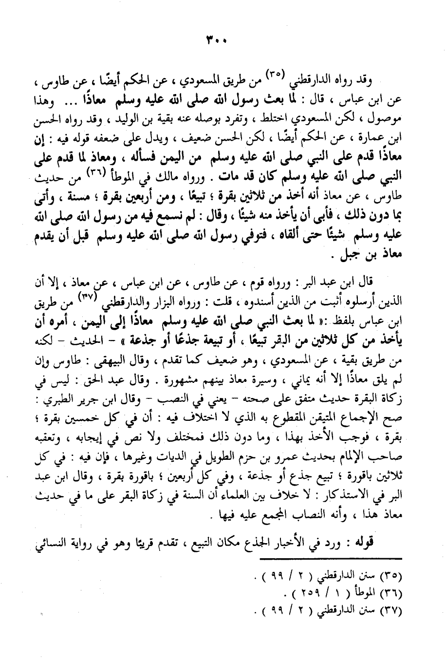 وَقَدْ رَوَاهُ الدَّارَقُطْنِيُّ مِنْ طَرِيقِ الْمَسْعُودِيِّ، عَنْ الْحَكَمِ أَيْضًا، عَنْ طَاوُسٍ، عَنْ ابْنِ عَبَّاسٍ، قَالَ: لَمَّا بَعَثَ رَسُولُ اللَّهِ - صَلَّى اللَّهُ عَلَيْهِ وَسَلَّمَ - مُعَاذًا. . . وَهَذَا مَوْصُولٌ لَكِنَّ الْمَسْعُودِيَّ اخْتَلَطَ، وَتَفَرَّدَ بِوَصْلِهِ عَنْهُ بَقِيَّةُ بْنُ الْوَلِيدِ، وَقَدْ رَوَاهُ الْحَسَنُ بْنُ عُمَارَةَ عَنْ الْحَكَمِ أَيْضًا، لَكِنَّ الْحَسَنَ ضَعِيفٌ، وَيَدُلُّ عَلَى ضَعْفِهِ قَوْلُهُ فِيهِ: إنَّ مُعَاذًا قَدِمَ عَلَى النَّبِيِّ - صَلَّى اللَّهُ عَلَيْهِ وَسَلَّمَ - مِنْ الْيَمَنِ فَسَأَلَهُ، وَمُعَاذٌ لَمَّا قَدِمَ عَلَى النَّبِيِّ - صَلَّى اللَّهُ عَلَيْهِ وَسَلَّمَ - كَانَ قَدْ مَاتَ. وَرَوَاهُ مَالِكٌ فِي الْمُوَطَّأِ مِنْ حَدِيثِ طَاوُسٍ، عَنْ مُعَاذٍ أَنَّهُ أَخَذَ مِنْ ثَلَاثِينَ بَقَرَةً تَبِيعًا، وَمِنْ أَرْبَعِينَ بَقَرَةً مُسِنَّةً، وَأُتِيَ بِمَا دُونَ ذَلِكَ، فَأَبَى أَنْ يَأْخُذَ مِنْهُ شَيْئًا، وَقَالَ: لَمْ نَسْمَعْ فِيهِ مِنْ رَسُولِ اللَّهِ - صَلَّى اللَّهُ عَلَيْهِ وَسَلَّمَ - شَيْئًا حَتَّى أَلْقَاهُ، فَتُوُفِّيَ - صَلَّى اللَّهُ عَلَيْهِ وَسَلَّمَ - قَبْلَ أَنْ يَقْدَمَ مُعَاذُ بْنُ جَبَلٍ قَالَ ابْنُ عَبْدِ الْبَرِّ: وَرَوَاهُ قَوْمٌ، عَنْ طَاوُسٍ، عَنْ ابْنِ عَبَّاسٍ، عَنْ مُعَاذٍ، إلَّا أَنَّ الَّذِينَ أَرْسَلُوا أَثْبَتُ مِنْ الَّذِينَ أَسْنَدُوهُ، قُلْت: وَرَوَاهُ الْبَزَّارُ وَالدَّارَقُطْنِيّ مِنْ طَرِيقِ ابْنِ عَبَّاسٍ بِلَفْظِ: «لَمَّا بَعَثَ النَّبِيُّ - صَلَّى اللَّهُ عَلَيْهِ وَسَلَّمَ - مُعَاذًا إلَى الْيَمَنِ، أَمَرَهُ أَنْ يَأْخُذَ مِنْ كُلِّ ثَلَاثِينَ مِنْ الْبَقَرِ تَبِيعًا، أَوْ تَبِيعَةً جَذَعًا أَوْ جَذَعَةً» - الْحَدِيثَ - لَكِنَّهُ مِنْ طَرِيقِ بَقِيَّةٍ عَنْ الْمَسْعُودِيِّ، وَهُوَ ضَعِيفٌ كَمَا تَقَدَّمَ، وَقَالَ الْبَيْهَقِيُّ: طَاوُسٌ وَإِنْ لَمْ يَلْقَ مُعَاذًا إلَّا أَنَّهُ يَمَانِيٌّ، وَسِيرَةُ مُعَاذٍ بَيْنَهُمْ مَشْهُورَةٌ. وَقَالَ عَبْدُ الْحَقِّ: لَيْسَ فِي زَكَاةِ الْبَقَرَةِ حَدِيثٌ مُتَّفَقٌ عَلَى صِحَّتِهِ - يَعْنِي فِي النُّصُبِ - وَقَالَ ابْنُ جَرِيرٍ الطَّبَرِيُّ: صَحَّ الْإِجْمَاعُ الْمُتَيَقَّنُ الْمَقْطُوعُ بِهِ الَّذِي لَا اخْتِلَافَ فِيهِ: أَنَّ فِي كُلِّ خَمْسِينَ بَقَرَةً بَقَرَةً، فَوَجَبَ الْأَخْذُ بِهَذَا، وَمَا دُونَ ذَلِكَ فَمُخْتَلِفٌ وَلَا نَصَّ فِي إيجَابِهِ، وَتَعَقَّبَهُ صَاحِبُ الْإِلْمَامِ بِحَدِيثِ عَمْرِو بْنِ حَزْمٍ الطَّوِيلِ فِي الدِّيَاتِ وَغَيْرِهَا، فَإِنَّ فِيهِ: فِي كُلِّ ثَلَاثِينَ بَاقُورَةٍ؛ تَبِيعٌ جَذَعٌ أَوْ جَذَعَةٌ، وَفِي كُلِّ أَرْبَعِينَ بَاقُورَةٍ بَقَرَةٌ، وَقَالَ ابْنُ عَبْدِ الْبَرِّ فِي الِاسْتِذْكَارِ: لَا خِلَافَ بَيْنَ الْعُلَمَاءِ أَنَّ السُّنَّةَ فِي زَكَاةِ الْبَقَرِ عَلَى مَا فِي حَدِيثِ مُعَاذٍ هَذَا، وَأَنَّهُ النِّصَابُ الْمُجْمَعُ عَلَيْهِ فِيهَا. قَوْلُهُ: وَرَدَ فِي الْأَخْبَارِ الْجَذَعُ مَكَانَ التَّبِيعِ، تَقَدَّمَ قَرِيبًا وَهُوَ فِي رِوَايَةِ النَّسَائِيّ