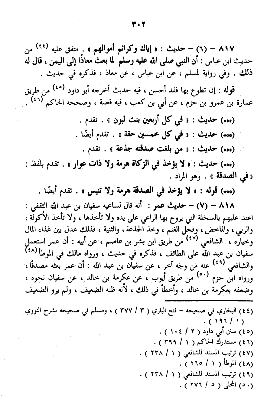 818 - (7) - حَدِيثُ عُمَرَ: أَنَّهُ قَالَ لِسَاعِيهِ سُفْيَانَ بْنِ عَبْدِ اللَّهِ الثَّقَفِيِّ: اعْتَدِ عَلَيْهِمْ بِالسَّخْلَةِ الَّتِي يَرُوحُ بِهَا الرَّاعِي عَلَى يَدِهِ وَلَا تَأْخُذْهَا، وَلَا تَأْخُذْ الْأَكُولَةَ، وَالرِّبِّيَّ، وَالْمَاخِضَ، وَفَحْلَ الْغَنَمِ، وَخُذْ الْجَذَعَةَ، وَالثَّنِيَّةَ، فَذَلِكَ عَدْلٌ بَيْنَ غِذَاءِ الْمَالِ وَخِيَارِهِ، الشَّافِعِيُّ مِنْ طَرِيقِ ابْنِ بِشْرِ بْنِ عَاصِمٍ، عَنْ أَبِيهِ: أَنَّ عُمَرَ اسْتَعْمَلَ سُفْيَانَ بْنَ عَبْدِ اللَّهِ عَلَى الطَّائِفِ، فَذَكَرَهُ فِي حَدِيثٍ، وَرَوَاهُ مَالِكٌ فِي الْمُوَطَّأِ وَالشَّافِعِيُّ عَنْهُ مِنْ وَجْهٍ آخَرَ، عَنْ سُفْيَانَ بْنِ عَبْدِ اللَّهِ: أَنَّ عُمَرَ بَعَثَهُ مُصَدِّقًا، وَرَوَاهُ ابْنُ حَزْمٍ مِنْ طَرِيقِ أَيُّوبَ، عَنْ عِكْرِمَةَ بْنِ خَالِدٍ، عَنْ سُفْيَانَ نَحْوُهُ، وَضَعَّفَهُ بِعِكْرِمَةَ بْنِ خَالِدٍ، وَأَخْطَأَ فِي ذَلِكَ؛ لِأَنَّهُ ظَنَّهُ الضَّعِيفَ، وَلَمْ يَرْوِ الضَّعِيفَ