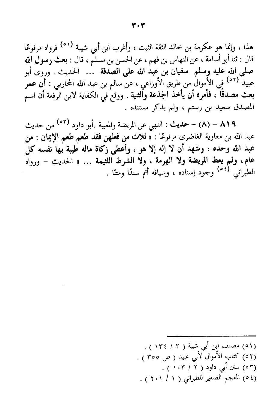 819 - (8) - حَدِيثُ: النَّهْيِ عَنْ الْمَرِيضَةِ وَالْمَعِيبَةِ. أَبُو دَاوُد مِنْ حَدِيثِ عَبْدِ اللَّهِ بْنِ مُعَاوِيَةَ الْغَاضِرِيِّ مَرْفُوعًا: «ثَلَاثٌ مَنْ فَعَلَهُنَّ فَقَدْ طَعِمَ طَعْمَ الْإِيمَانِ: مَنْ عَبَدَ اللَّهَ وَحْدَهُ، وَشَهِدَ أَنْ لَا إلَهَ إلَّا هُوَ، وَأَعْطَى زَكَاةَ مَالِهِ طَيِّبَةً بِهَا نَفْسُهُ كُلَّ عَامٍ، وَلَمْ يُعْطِ الْمَرِيضَةَ وَلَا الْهَرِمَةَ، وَلَا الشُّرَطَ اللَّئِيمَةَ. . .» الْحَدِيثَ - وَرَوَاهُ الطَّبَرَانِيُّ وَجَوَّدَ إسْنَادَهُ، وَسِيَاقُهُ أَتَمُّ سَنَدًا وَمَتْنًا.