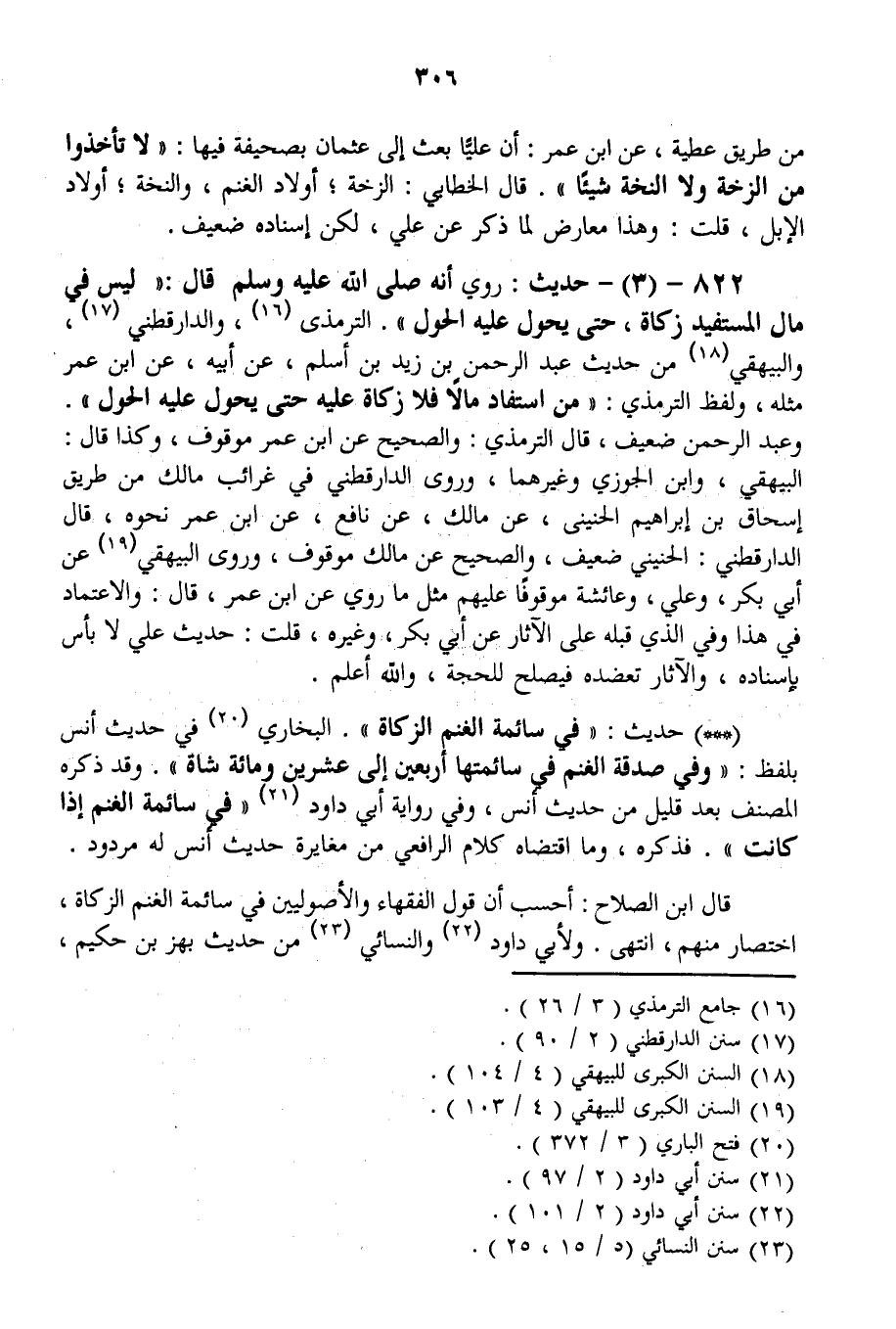822 - (3) - حَدِيثُ: رُوِيَ أَنَّهُ - صَلَّى اللَّهُ عَلَيْهِ وَسَلَّمَ - قَالَ: «لَيْسَ فِي مَالِ الْمُسْتَفِيدِ زَكَاةٌ، حَتَّى يَحُولَ عَلَيْهِ الْحَوْلُ» . التِّرْمِذِيُّ، وَالدَّارَقُطْنِيّ، وَالْبَيْهَقِيُّ مِنْ حَدِيثِ عَبْدِ الرَّحْمَنِ بْنِ زَيْدِ بْنِ أَسْلَمَ، عَنْ أَبِيهِ، عَنْ ابْنِ عُمَرَ مِثْلُهُ وَلَفْظُ التِّرْمِذِيِّ: «مَنْ اسْتَفَادَ مَالًا فَلَا زَكَاةَ عَلَيْهِ حَتَّى يَحُولَ عَلَيْهِ الْحَوْلُ» . وَعَبْدُ الرَّحْمَنِ ضَعِيفٌ، قَالَ التِّرْمِذِيُّ: وَالصَّحِيحُ عَنْ ابْنِ عُمَرَ مَوْقُوفٌ، وَكَذَا قَالَ: الْبَيْهَقِيُّ، وَابْنُ الْجَوْزِيِّ وَغَيْرُهُمَا.