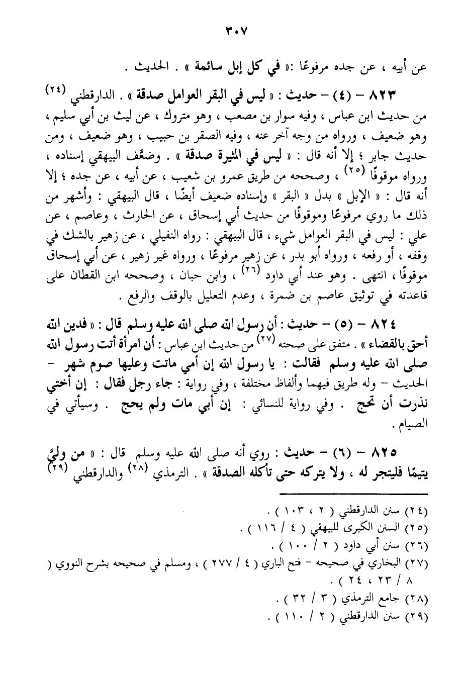 823 - (4) - حَدِيثُ: «لَيْسَ فِي الْبَقَرِ الْعَوَامِلِ صَدَقَةٌ» . الدَّارَقُطْنِيُّ مِنْ حَدِيثِ ابْنِ عَبَّاسٍ، وَفِيهِ سَوَّارُ بْنُ مَصْعَبٍ، وَهُوَ مَتْرُوكٌ، عَنْ لَيْثِ بْنِ أَبِي سُلَيْمٍ، وَهُوَ ضَعِيفٌ، وَرَوَاهُ مِنْ وَجْهٍ آخَرَ عَنْهُ، وَفِيهِ الصَّقْرُ بْنُ حَبِيبٍ، وَهُوَ ضَعِيفٌ، وَمِنْ حَدِيثِ جَابِرٍ؛ إلَّا أَنَّهُ قَالَ: «لَيْسَ فِي الْمُثِيرَةِ صَدَقَةٌ» . وَضَعَّفَ الْبَيْهَقِيُّ إسْنَادَهُ، وَرَوَاهُ مَوْقُوفًا، وَصَحَّحَهُ مِنْ طَرِيقِ عَمْرِو بْنِ شُعَيْبٍ، عَنْ أَبِيهِ، عَنْ جَدِّهِ؛ إلَّا أَنَّهُ قَالَ: " الْإِبِلِ " بَدَلَ " الْبَقَرِ " وَإِسْنَادُهُ ضَعِيفٌ أَيْضًا، قَالَ الْبَيْهَقِيُّ: وَأَشْهَرُ مِنْ ذَلِكَ مَا رُوِيَ مَرْفُوعًا وَمَوْقُوفًا مِنْ حَدِيثِ أَبِي إِسْحَاقَ، عَنْ الْحَارِثِ، وَعَاصِمٍ، عَنْ عَلِيٍّ: لَيْسَ فِي الْبَقَرِ الْعَوَامِلِ شَيْءٌ، قَالَ الْبَيْهَقِيُّ: رَوَاهُ النُّفَيْلِيُّ، عَنْ زُهَيْرٍ بِالشَّكِّ فِي وَقْفِهِ، أَوْ رَفْعِهِ، وَرَوَاهُ أَبُو بَدْرٍ، عَنْ زُهَيْرٍ مَرْفُوعًا، وَرَوَاهُ غَيْرُ زُهَيْرٍ، عَنْ أَبِي إِسْحَاقَ مَوْقُوفًا، انْتَهَى. وَهُوَ عِنْدَ أَبِي دَاوُد، وَابْنِ حِبَّانَ، وَصَحَّحَهُ ابْنُ الْقَطَّانِ عَلَى قَاعِدَتِهِ فِي تَوْثِيقِ عَاصِمِ بْنِ ضَمْرَةَ، وَعَدَمِ التَّعْلِيلِ بِالْوَقْفِ وَالرَّفْعِ.