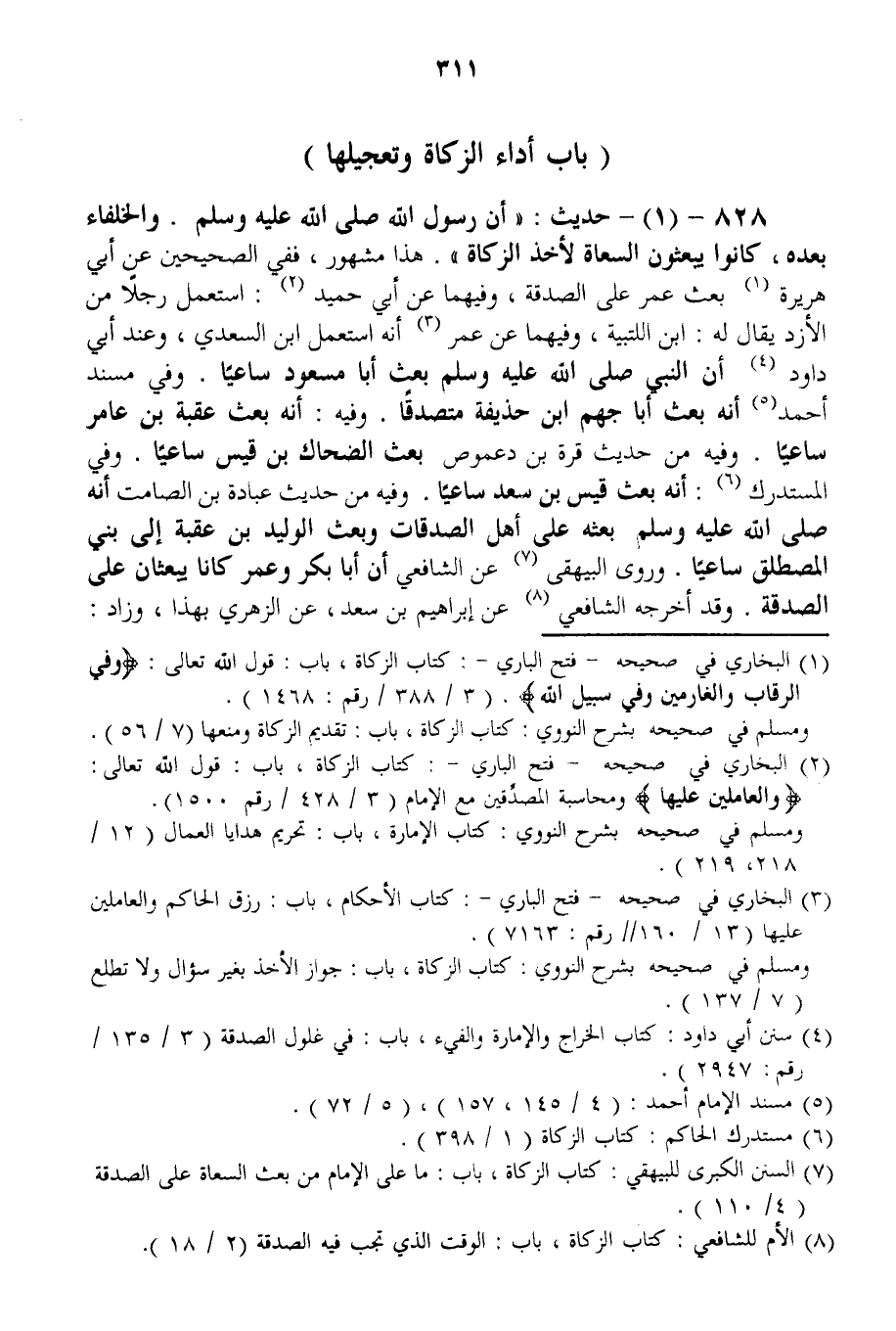828 - حَدِيثُ: «أَنَّ رَسُولَ اللَّهِ - صَلَّى اللَّهُ عَلَيْهِ وَسَلَّمَ -. وَالْخُلَفَاءَ بَعْدَهُ، كَانُوا يَبْعَثُونَ السُّعَاةَ لِأَخْذِ الزَّكَاةِ» . هَذَا مَشْهُورٌ، فَفِي الصَّحِيحَيْنِ عَنْ أَبِي هُرَيْرَةَ بَعَثَ عُمَرُ عَلَى الصَّدَقَةِ، وَفِيهِمَا عَنْ أَبِي حُمَيْدٍ: اسْتَعْمَلَ رَجُلًا مِنْ الْأَزْدِ يُقَالُ لَهُ: ابْنُ اللُّتْبِيَّةِ، وَفِيهِمَا عَنْ عُمَرَ أَنَّهُ اسْتَعْمَلَ ابْنَ السَّعْدِيِّ، وَعِنْدَ أَبِي دَاوُد أَنَّ «النَّبِيَّ - صَلَّى اللَّهُ عَلَيْهِ وَسَلَّمَ - بَعَثَ أَبَا مَسْعُودٍ سَاعِيًا» . وَفِي مُسْنَدِ أَحْمَدَ أَنَّهُ بَعَثَ أَبَا جَهْمِ بْنَ حُذَيْفَةَ مُتَصَدِّقًا. وَفِيهِ: أَنَّهُ بَعَثَ عُقْبَةَ بْنَ عَامِرٍ سَاعِيًا. وَفِيهِ مِنْ حَدِيثِ قُرَّةَ بْنِ دَعْمُوصٍ بَعَثَ الضَّحَّاكَ بْنَ قَيْسٍ سَاعِيًا. وَفِي الْمُسْتَدْرَكِ: أَنَّهُ بَعَثَ قَيْسَ بْنَ سَعْدٍ سَاعِيًا. وَفِيهِ مِنْ حَدِيثِ «عُبَادَةَ بْنِ الصَّامِتِ أَنَّهُ - صَلَّى اللَّهُ عَلَيْهِ وَسَلَّمَ - بَعَثَهُ عَلَى أَهْلِ الصَّدَقَاتِ وَبَعَثَ الْوَلِيدَ بْنَ عُقْبَةَ إلَى بَنِي الْمُصْطَلِقِ سَاعِيًا» وَرَوَى الْبَيْهَقِيّ عَنْ الشَّافِعِيِّ أَنَّ أَبَا بَكْرٍ وَعُمَرَ كَانَا يَبْعَثَانِ عَلَى الصَّدَقَةِ. وَقَدْ أَخْرَجَهُ الشَّافِعِيُّ عَنْ إبْرَاهِيمَ بْنِ سَعْدٍ، عَنْ الزُّهْرِيِّ بِهَذَا، وَزَادَ: