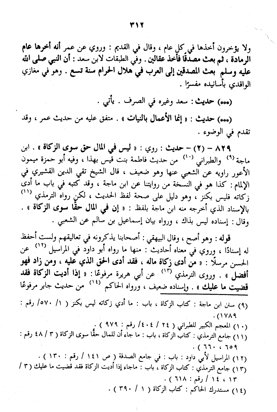 829 - (2) - حَدِيثُ: رُوِيَ: «لَيْسَ فِي الْمَالِ حَقٌّ سِوَى الزَّكَاةِ» . ابْنُ مَاجَهْ وَالطَّبَرَانِيُّ مِنْ حَدِيثِ فَاطِمَةَ بِنْتِ قَيْسٍ بِهَذَا، وَفِيهِ أَبُو حَمْزَةَ مَيْمُونُ الْأَعْوَرُ رَاوِيهِ عَنْ الشَّعْبِيِّ عَنْهَا وَهُوَ ضَعِيفٌ، قَالَ الشَّيْخُ تَقِيُّ الدِّينِ الْقُشَيْرِيُّ فِي الْإِلْمَامِ: كَذَا هُوَ فِي النُّسْخَةِ مِنْ رِوَايَتِنَا عَنْ ابْنِ مَاجَهْ، وَقَدْ كَتَبَهُ فِي بَابِ مَا أُدِّيَ زَكَاتُهُ فَلَيْسَ بِكَنْزٍ، وَهُوَ دَلِيلٌ عَلَى صِحَّةِ لَفْظِ الْحَدِيثِ، لَكِنْ رَوَاهُ التِّرْمِذِيُّ بِالْإِسْنَادِ الَّذِي أَخْرَجَهُ مِنْهُ ابْنُ مَاجَهْ بِلَفْظِ: «إنَّ فِي الْمَالِ حَقًّا سِوَى الزَّكَاةِ» . وَقَالَ: إسْنَادُهُ لَيْسَ بِذَاكَ، وَرَوَاهُ بَيَانُ إسْمَاعِيلُ بْنُ سَالِمٍ عَنْ الشَّعْبِيِّ. قَوْلُهُ: وَهُوَ أَصَحُّ، وَقَالَ الْبَيْهَقِيُّ: أَصْحَابُنَا يَذْكُرُونَهُ فِي تَعَالِيقِهِمْ وَلَسْت أَحْفَظُ لَهُ إسْنَادًا.