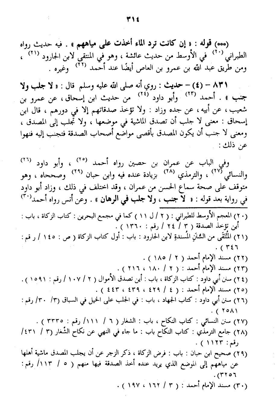 831 - (4) - حَدِيثُ: رُوِيَ أَنَّهُ - صَلَّى اللَّهُ عَلَيْهِ وَسَلَّمَ - قَالَ: «لَا جَلَبَ وَلَا جَنَبَ» . أَحْمَدُ وَأَبُو دَاوُد مِنْ حَدِيثِ ابْنِ إِسْحَاقَ، عَنْ عَمْرِو بْنِ شُعَيْبٍ، عَنْ أَبِيهِ، عَنْ جَدِّهِ وَزَادَ: وَلَا تُؤْخَذُ صَدَقَاتُهُمْ إلَّا فِي دُورِهِمْ، قَالَ، ابْنُ إِسْحَاقَ: مَعْنَى لَا جَلَبَ أَنْ تُصَدَّقَ الْمَاشِيَةُ فِي مَوْضِعِهَا، وَلَا تُجْلَبُ إلَى الْمُصَدِّقِ، وَمَعْنَى لَا جَنَبَ أَنْ يَكُونَ الْمُصَدِّقُ بِأَقْصَى مَوَاضِعِ أَصْحَابِ الصَّدَقَةِ فَتُجَنَّبُ إلَيْهِ فَنُهُوا عَنْ ذَلِكَ: وَفِي الْبَابِ عَنْ عِمْرَانَ بْنِ حُصَيْنٍ رَوَاهُ أَحْمَدُ، وَأَبُو دَاوُد وَالنَّسَائِيُّ، وَالتِّرْمِذِيُّ بِزِيَادَةٍ عِنْدَهُ فِيهِ وَابْنُ حِبَّانَ وَصَحَّحَاهُ، وَهُوَ مُتَوَقِّفٌ عَلَى صِحَّةِ سَمَاعِ الْحَسَنِ مِنْ عِمْرَانَ، وَقَدْ اُخْتُلِفَ فِي ذَلِكَ، وَزَادَ أَبُو دَاوُد فِي رِوَايَةٍ بَعْدَ قَوْلِهِ: «لَا جَنَبَ، وَلَا جَلَبَ فِي الرِّهَانِ» . وَعَنْ أَنَسٍ رَوَاهُ أَحْمَدُ