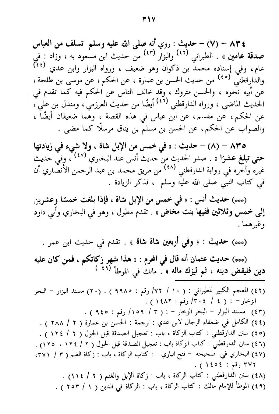 835 - (8) - حَدِيثُ: " «فِي خَمْسٍ مِنْ الْإِبِلِ شَاةٌ، وَلَا شَيْءَ فِي زِيَادَتِهَا حَتَّى تَبْلُغَ عَشْرًا» . صَدَرَ الْحَدِيثُ مِنْ حَدِيثِ أَنَسٍ عِنْدَ الْبُخَارِيِّ، وَفِي حَدِيثِ غَيْرِهِ، وَآخِرُهُ فِي رِوَايَةِ الدَّارَقُطْنِيِّ مِنْ طَرِيقِ مُحَمَّدِ بْنِ عَبْدِ الرَّحْمَنِ الْأَنْصَارِيِّ أَنَّ فِي كِتَابِ النَّبِيِّ - صَلَّى اللَّهُ عَلَيْهِ وَسَلَّمَ -، فَذَكَرَ الزِّيَادَةَ. حَدِيثُ أَنَسٍ: «فِي خَمْسٍ مِنْ الْإِبِلِ شَاةٌ، فَإِذَا بَلَغَتْ خَمْسًا وَعِشْرِينَ إلَى خَمْسٍ وَثَلَاثِينَ فَفِيهَا بِنْتُ مَخَاضٍ» . تَقَدَّمَ مُطَوَّلًا، وَهُوَ فِي الْبُخَارِيِّ وَأَبِي دَاوُد وَغَيْرِهِمَا. حَدِيثُ: «وَفِي أَرْبَعِينَ شَاةٍ شَاةٌ» . تَقَدَّمَ فِي حَدِيثِ ابْنِ عُمَرَ. حَدِيثُ عُثْمَانَ أَنَّهُ قَالَ فِي الْمُحَرَّمِ: " هَذَا شَهْرُ زَكَاتِكُمْ، فَمَنْ كَانَ عَلَيْهِ دَيْنٌ فَلْيَقْضِ دِينَهُ، ثُمَّ لِيُزَكِّ مَالَهُ " مَالِكٌ فِي الْمُوَطَّأِ
