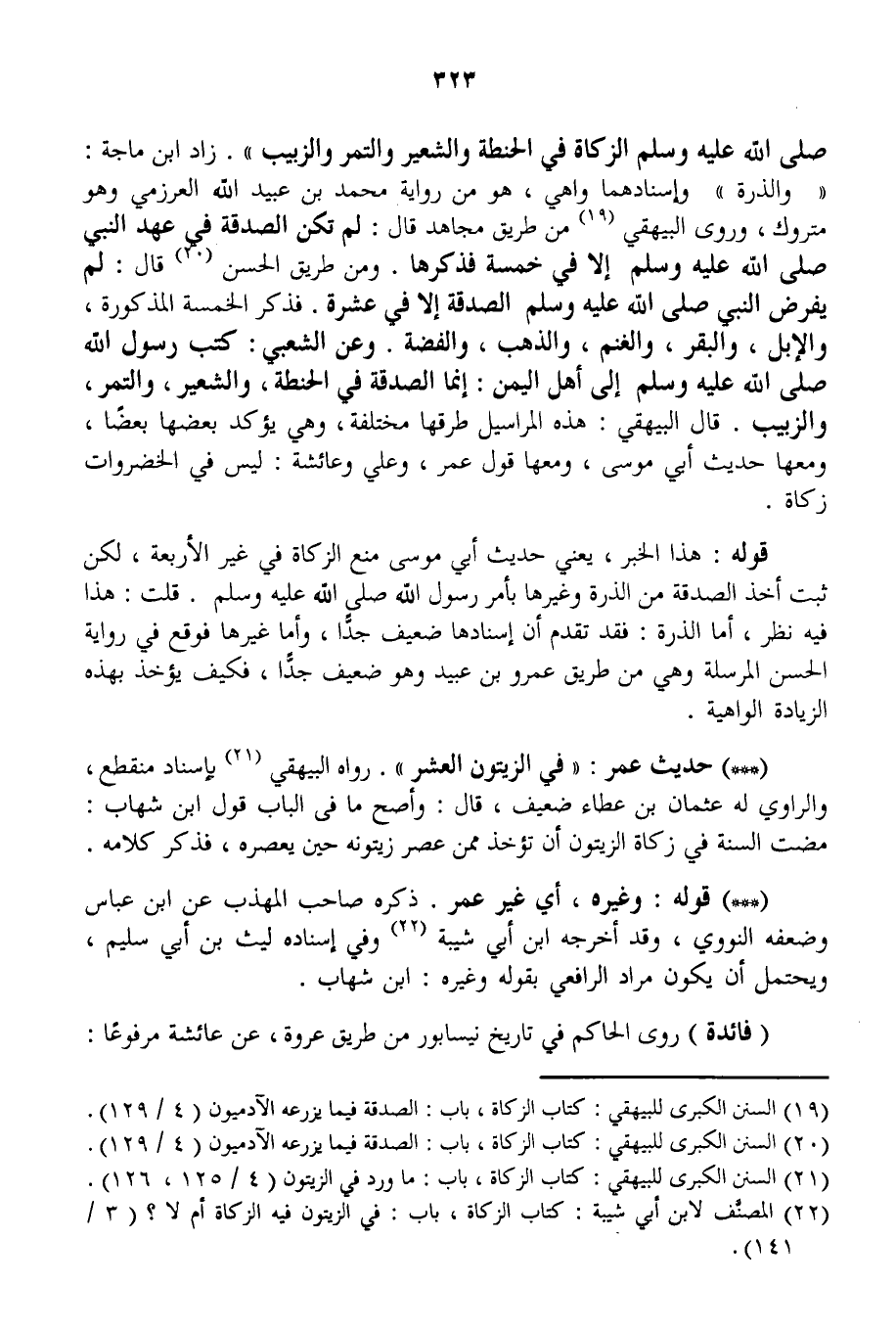 - صَلَّى اللَّهُ عَلَيْهِ وَسَلَّمَ - الزَّكَاةَ فِي الْحِنْطَةِ وَالشَّعِيرِ وَالتَّمْرِ وَالزَّبِيبِ» زَادَ ابْنُ مَاجَهْ: " وَالذُّرَةِ " وَإِسْنَادُهُمَا وَاهٍ، هُوَ مِنْ رِوَايَةِ مُحَمَّدِ بْنِ عُبَيْدِ اللَّهِ الْعَرْزَمِيِّ وَهُوَ مَتْرُوكٌ.