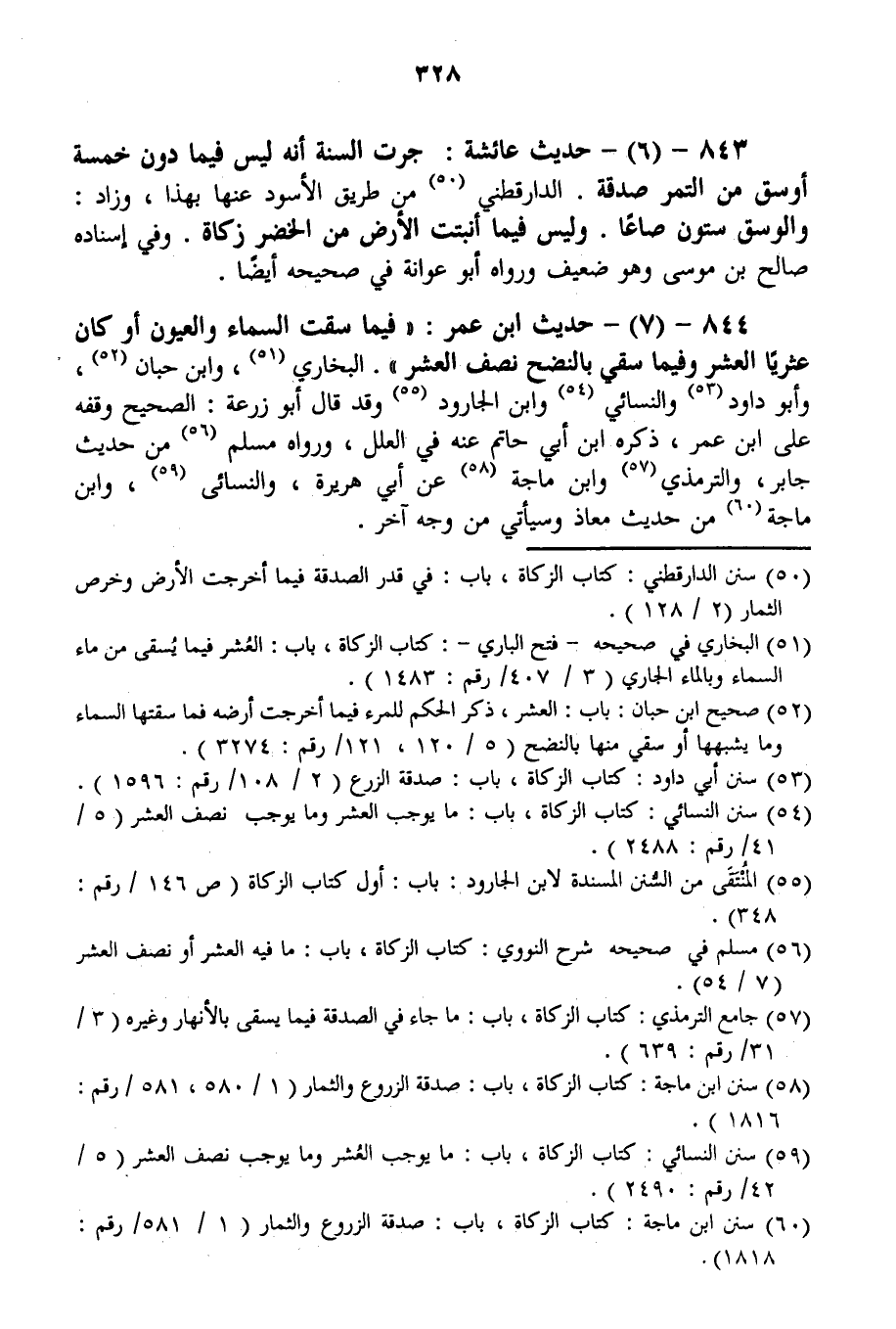844 - (7) - حَدِيثُ ابْنِ عُمَرَ: «فِيمَا سَقَتْ السَّمَاءُ وَالْعُيُونُ أَوْ كَانَ عَثَرِيًّا الْعُشْرُ وَفِيمَا سُقِيَ بِالنَّضْحِ نِصْفُ الْعُشْرِ» . الْبُخَارِيُّ، وَابْنُ حِبَّانَ، وَأَبُو دَاوُد وَالنَّسَائِيُّ وَابْنُ الْجَارُودِ وَقَدْ قَالَ أَبُو زُرْعَةَ: الصَّحِيحُ وَقْفُهُ عَلَى ابْنِ عُمَرَ، ذَكَرَهُ ابْنُ أَبِي حَاتِمٍ عَنْهُ فِي الْعِلَلِ، وَرَوَاهُ مُسْلِمٌ مِنْ حَدِيثِ جَابِرٍ، وَالتِّرْمِذِيُّ وَابْنُ مَاجَهْ عَنْ أَبِي هُرَيْرَةَ، وَالنَّسَائِيُّ، وَابْنُ مَاجَهْ مِنْ حَدِيثِ مُعَاذٍ وَسَيَأْتِي مِنْ وَجْهٍ آخَرَ.
