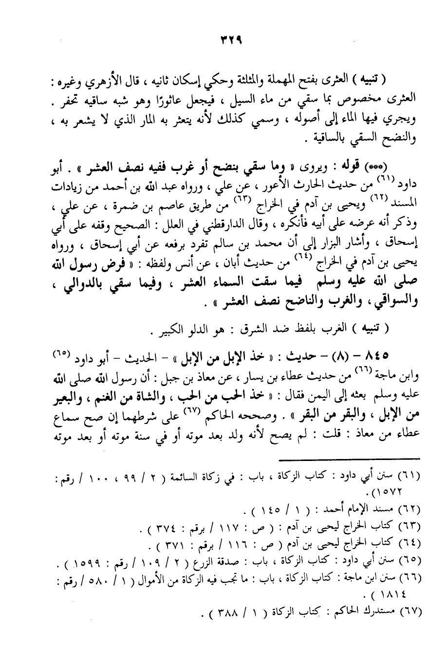 (* * *) قَوْلُهُ: وَيُرْوَى «وَمَا سُقِيَ بِنَضْحٍ أَوْ غَرْبٍ فَفِيهِ نِصْفُ الْعُشْرِ» . أَبُو دَاوُد مِنْ حَدِيثِ الْحَارِثِ الْأَعْوَرِ، عَنْ عَلِيٍّ، وَرَوَاهُ عَبْدُ اللَّهِ بْنُ أَحْمَدَ مِنْ زِيَادَاتِ الْمُسْنَدِ وَيَحْيَى بْنُ آدَمَ فِي الْخَرَاجِ مِنْ طَرِيقِ عَاصِمِ بْنِ ضَمْرَةَ، عَنْ عَلِيٍّ، وَذَكَرَ أَنَّهُ عَرَضَهُ عَلَى أَبِيهِ فَأَنْكَرَهُ، وَقَالَ الدَّارَقُطْنِيُّ فِي الْعِلَلِ: الصَّحِيحُ وَقْفُهُ عَلَى أَبِي إِسْحَاقَ، وَأَشَارَ الْبَزَّارُ إلَى أَنَّ مُحَمَّدَ بْنَ سَالِمٍ تَفَرَّدَ بِرَفْعِهِ عَنْ أَبِي إِسْحَاقَ، وَرَوَاهُ يَحْيَى بْنُ آدَمَ فِي الْخَرَاجِ مِنْ حَدِيثِ أَبَانَ، عَنْ أَنَسٍ وَلَفْظُهُ: «فَرَضَ رَسُولُ اللَّهِ - صَلَّى اللَّهُ عَلَيْهِ وَسَلَّمَ - فِيمَا سَقَتْ السَّمَاءُ الْعُشْرَ، وَفِيمَا سُقِيَ بِالدَّوَالِي، وَالسَّوَاقِي، وَالْغَرْبِ وَالنَّاضِحِ نِصْفُ الْعُشْرِ» .