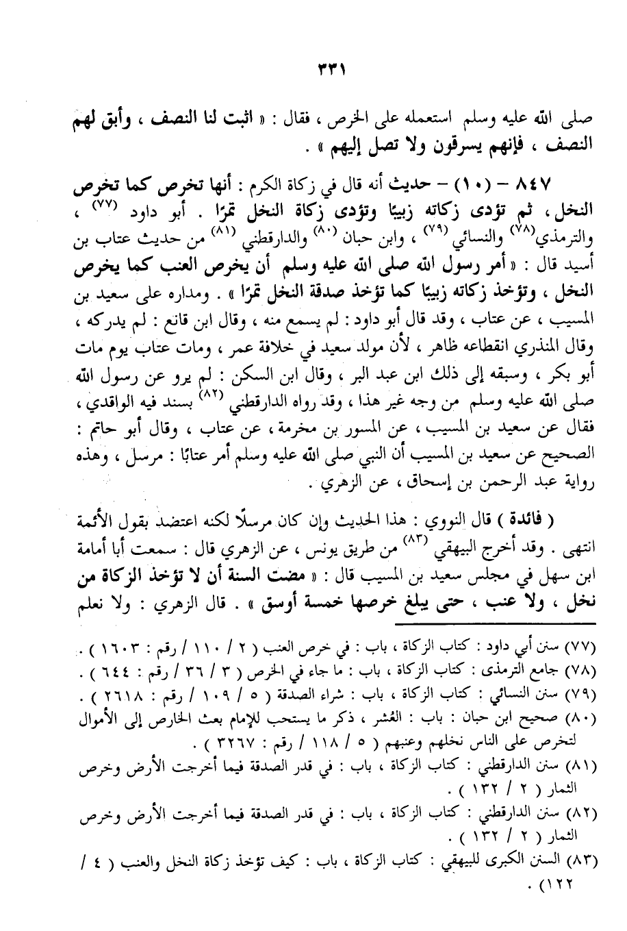 847 - (10) - حَدِيثُ أَنَّهُ قَالَ فِي زَكَاةِ الْكَرْمِ: «أَنَّهَا تُخْرَصُ كَمَا تُخْرَصُ النَّخْلُ، ثُمَّ تُؤَدَّى زَكَاتُهُ زَبِيبًا وَتُؤَدَّى زَكَاةُ النَّخْلِ تَمْرًا» . أَبُو دَاوُد، وَالتِّرْمِذِيُّ وَالنَّسَائِيُّ، وَابْنُ حِبَّانَ وَالدَّارَقُطْنِيّ مِنْ حَدِيثِ عَتَّابِ بْنِ أَسِيدٍ قَالَ: «أَمَرَ رَسُولُ اللَّهِ - صَلَّى اللَّهُ عَلَيْهِ وَسَلَّمَ - أَنْ يُخْرَصَ الْعِنَبُ كَمَا يُخْرَصُ النَّخْلُ، وَتُؤْخَذُ زَكَاتُهُ زَبِيبًا كَمَا تُؤْخَذُ صَدَقَةُ النَّخْلِ تَمْرًا» . وَمَدَارُهُ عَلَى سَعِيدِ بْنِ الْمُسَيِّبِ، عَنْ عَتَّابٍ، وَقَدْ قَالَ أَبُو دَاوُد: لَمْ يَسْمَعْ مِنْهُ، وَقَالَ ابْنُ قَانِعٍ: لَمْ يُدْرِكْهُ، وَقَالَ الْمُنْذِرِيُّ انْقِطَاعُهُ ظَاهِرٌ؛ لِأَنَّ مَوْلِدَ سَعِيدٍ فِي خِلَافَةِ عُمَرَ، وَمَاتَ عَتَّابٌ يَوْمَ مَاتَ أَبُو بَكْرٍ، وَسَبَقَهُ إلَى ذَلِكَ ابْنُ عَبْدِ الْبَرِّ، وَقَالَ ابْنُ السَّكَنِ: لَمْ يُرْوَ عَنْ رَسُولِ اللَّهِ - صَلَّى اللَّهُ عَلَيْهِ وَسَلَّمَ - مِنْ وَجْهٍ غَيْرِ هَذَا، وَقَدْ رَوَاهُ الدَّارَقُطْنِيُّ بِسَنَدٍ فِيهِ الْوَاقِدِيُّ، فَقَالَ عَنْ سَعِيدِ بْنِ الْمُسَيِّبِ، عَنْ الْمِسْوَرِ بْنِ مَخْرَمَةَ، عَنْ عَتَّابٍ، وَقَالَ أَبُو حَاتِمٍ: الصَّحِيحُ عَنْ سَعِيدِ بْنِ الْمُسَيِّبِ أَنَّ النَّبِيَّ - صَلَّى اللَّهُ عَلَيْهِ وَسَلَّمَ - أَمَرَ عَتَّابًا: مُرْسَلٌ، وَهَذِهِ رِوَايَةُ عَبْدِ الرَّحْمَنِ بْنِ إِسْحَاقَ، عَنْ الزُّهْرِيِّ.