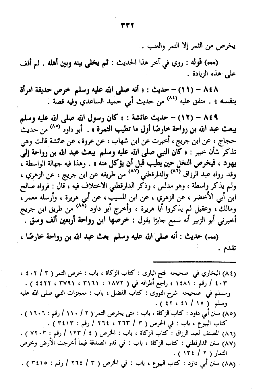 849 - (12) - حَدِيثُ عَائِشَةَ: «كَانَ رَسُولُ اللَّهِ - صَلَّى اللَّهُ عَلَيْهِ وَسَلَّمَ - يَبْعَثُ عَبْدَ اللَّهِ بْنَ رَوَاحَةَ خَارِصًا أَوَّلَ مَا تَطِيبُ الثَّمَرَةُ» . أَبُو دَاوُد مِنْ حَدِيثِ حَجَّاجٍ، عَنْ ابْنِ جُرَيْجٍ، أُخْبِرْتُ عَنْ ابْنِ شِهَابٍ، عَنْ عُرْوَةَ، عَنْ عَائِشَةَ قَالَتْ وَهِيَ تَذْكُرُ شَأْنَ خَيْبَرَ: «كَانَ النَّبِيُّ - صَلَّى اللَّهُ عَلَيْهِ وَسَلَّمَ - يَبْعَثُ عَبْدَ اللَّهِ بْنَ رَوَاحَةَ إلَى يَهُودَ، فَيَخْرُصُ النَّخْلَ حِينَ يَطِيبُ قَبْلَ أَنْ يُؤْكَلَ مِنْهُ» . وَهَذَا فِيهِ جَهَالَةُ الْوَاسِطَةِ، وَقَدْ رَوَاهُ عَبْدُ الرَّزَّاقِ وَالدَّارَقُطْنِيّ مِنْ طَرِيقِهِ عَنْ ابْنِ جُرَيْجٍ، عَنْ الزُّهْرِيِّ، وَلَمْ يَذْكُرْ وَاسِطَةً، وَهُوَ مُدَلِّسٌ، وَذَكَرَ الدَّارَقُطْنِيُّ الِاخْتِلَافَ فِيهِ، قَالَ. فَرَوَاهُ صَالِحُ بْنُ أَبِي الْأَخْضَرِ، عَنْ الزُّهْرِيِّ، عَنْ ابْنِ الْمُسَيِّبِ، عَنْ أَبِي هُرَيْرَةَ، وَأَرْسَلَهُ مَعْمَرٌ، وَمَالِكٌ، وَعُقَيْلٌ لَمْ يَذْكُرُوا أَبَا هُرَيْرَةَ، وَأَخْرَجَ أَبُو دَاوُد مِنْ طَرِيقِ ابْنِ جُرَيْجٍ أَخْبَرَنِي أَبُو الزُّبَيْرِ أَنَّهُ سَمِعَ جَابِرًا يَقُولُ: خَرَصَهَا ابْنُ رَوَاحَةَ أَرْبَعِينَ أَلْفَ وَسْقٍ. () حَدِيثُ: «أَنَّهُ - صَلَّى اللَّهُ عَلَيْهِ وَسَلَّمَ - بَعَثَ عَبْدَ اللَّهِ بْنَ رَوَاحَةَ خَارِصًا» ، تَقَدَّمَ.
