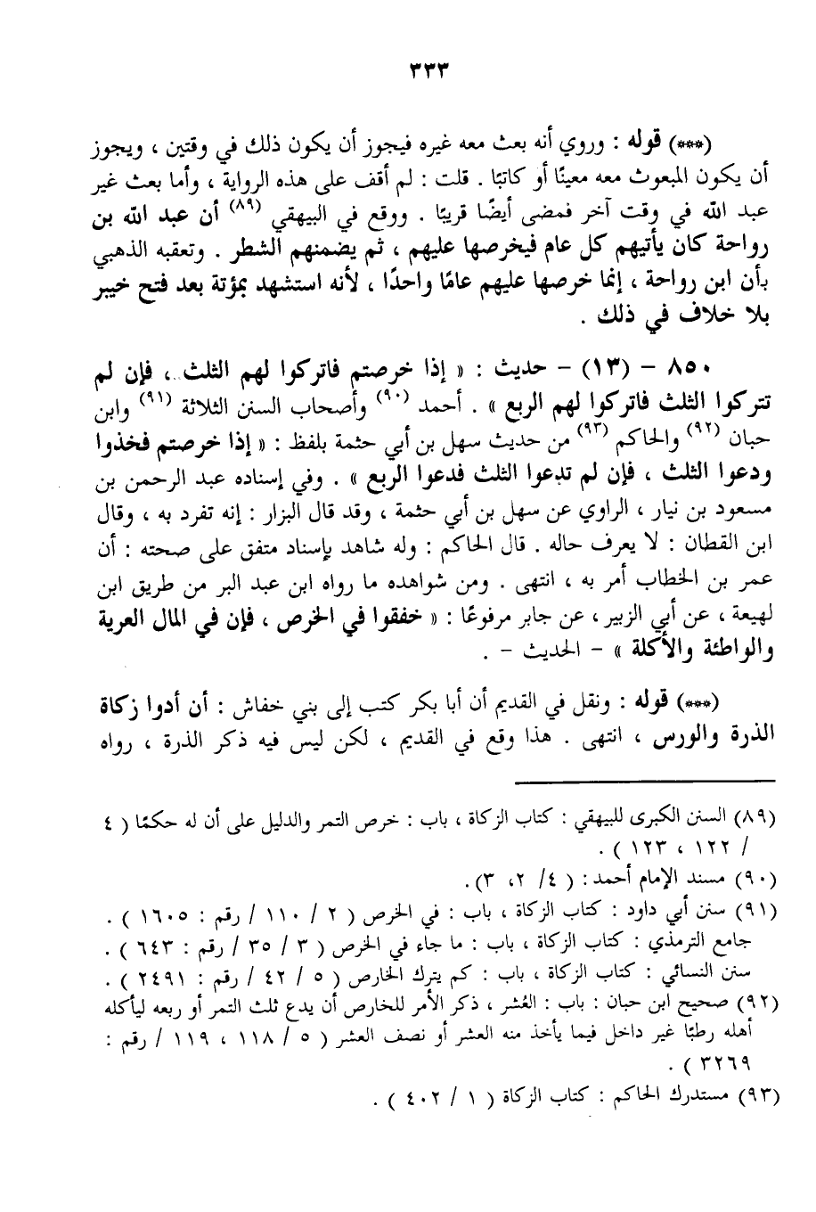 850 - (13) - حَدِيثُ: «إذَا خَرَصْتُمْ فَاتْرُكُوا لَهُمْ الثُّلُثَ، فَإِنْ لَمْ تَتْرُكُوا الثُّلُثَ فَاتْرُكُوا لَهُمْ الرُّبُعَ» . أَحْمَدُ وَأَصْحَابُ السُّنَنِ الثَّلَاثَةِ وَابْنُ حِبَّانَ وَالْحَاكِمُ مِنْ حَدِيثِ سَهْلِ بْنِ أَبِي حَثْمَةَ بِلَفْظِ: «إذَا خَرَصْتُمْ فَخُذُوا وَدَعُوا الثُّلُثَ، فَإِنْ لَمْ تَدَعُوا الثُّلُثَ فَدَعُوا الرُّبُعَ» . وَفِي إسْنَادِهِ عَبْدُ الرَّحْمَنِ بْنُ مَسْعُودٍ بْنُ نِيَارٍ، الرَّاوِي عَنْ سَهْلِ بْنِ أَبِي حَثْمَةَ، وَقَدْ قَالَ الْبَزَّارُ: إنَّهُ تَفَرَّدَ بِهِ، وَقَالَ ابْنُ الْقَطَّانِ: لَا يُعْرَفُ حَالُهُ. قَالَ الْحَاكِمُ: وَلَهُ شَاهِدٌ بِإِسْنَادٍ مُتَّفَقٍ عَلَى صِحَّتِهِ: أَنَّ عُمَرَ بْنَ الْخَطَّابِ أَمَرَ بِهِ، انْتَهَى. وَمِنْ شَوَاهِدِهِ مَا رَوَاهُ ابْنُ عَبْدِ الْبَرِّ مِنْ طَرِيقِ ابْنِ لَهِيعَةَ، عَنْ أَبِي الزُّبَيْرِ، عَنْ جَابِرٍ مَرْفُوعًا: «خَفِّفُوا فِي الْخَرْصِ، فَإِنَّ فِي الْمَالِ الْعَرِيَّةَ وَالْوَاطِئَةَ وَالْأُكَلَةَ» - الْحَدِيثَ -.