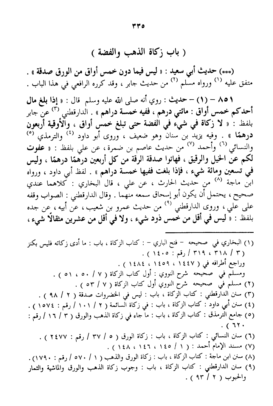 851 - (1) - حَدِيثُ: رُوِيَ أَنَّهُ - صَلَّى اللَّهُ عَلَيْهِ وَسَلَّمَ - قَالَ: «إذَا بَلَغَ مَالُ أَحَدِكُمْ خَمْسَ أَوَاقٍ: مِائَتَيْ دِرْهَمٍ، فَفِيهِ خَمْسَةُ دَرَاهِمَ» . الدَّارَقُطْنِيُّ عَنْ جَابِرٍ بِلَفْظِ: «لَا زَكَاةَ فِي شَيْءٍ فِي الْفِضَّةِ حَتَّى تَبْلُغَ خَمْسَ أَوَاقٍ، وَالْأُوقِيَّةُ أَرْبَعُونَ دِرْهَمًا» . وَفِيهِ يَزِيدُ بْنُ سِنَانٍ وَهُوَ ضَعِيفٌ.