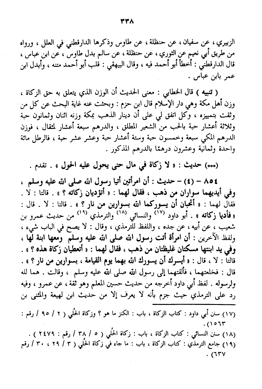 854 - (4) - حَدِيثُ: «أَنَّ امْرَأَتَيْنِ أَتَيَا رَسُولَ اللَّهِ - صَلَّى اللَّهُ عَلَيْهِ وَسَلَّمَ - وَفِي أَيْدِيهمَا سُوَارَانِ مِنْ ذَهَبٍ، فَقَالَ لَهُمَا: أَتُؤَدِّيَانِ زَكَاتَهُ؟ . قَالَتَا: لَا. فَقَالَ لَهُمَا: أَتُحِبَّانِ أَنْ يُسَوِّرَكُمَا اللَّهُ بِسُوَارَيْنِ مِنْ نَارٍ؟ . قَالَتَا: لَا. قَالَ: فَأَدِّيَا زَكَاتَهُ» . أَبُو دَاوُد وَالنَّسَائِيُّ وَالتِّرْمِذِيُّ مِنْ حَدِيثِ عَمْرِو بْنِ شُعَيْبٍ، عَنْ أَبِيهِ، عَنْ جَدِّهِ، وَاللَّفْظُ لِلتِّرْمِذِيِّ، وَقَالَ: لَا يَصِحُّ فِي الْبَابِ شَيْءٌ، وَلَفْظُ الْآخَرِينَ: أَنَّ «امْرَأَةً أَتَتْ رَسُولَ اللَّهِ - صَلَّى اللَّهُ عَلَيْهِ وَسَلَّمَ - وَمَعَهَا ابْنَةٌ لَهَا، وَفِي يَدِ ابْنَتِهَا مِسْكَتَانِ غَلِيظَتَانِ مِنْ ذَهَبٍ، فَقَالَ لَهُمَا: أَتُعْطِيَانِ زَكَاةَ هَذِهِ؟ . قَالَتَا: لَا، قَالَ: أَيَسُرُّكِ أَنْ يُسَوِّرَك اللَّهُ بِهِمَا يَوْمَ الْقِيَامَةِ، بِسُوَارَيْنِ مِنْ نَارٍ؟ . قَالَ: فَخَلَعَتْهُمَا، فَأَلْقَتْهُمَا إلَى رَسُولِ اللَّهِ - صَلَّى اللَّهُ عَلَيْهِ وَسَلَّمَ -، وَقَالَتْ. هُمَا لِلَّهِ وَلِرَسُولِهِ» . لَفْظُ أَبِي دَاوُد أَخْرَجَهُ مِنْ حَدِيثِ حُسَيْنٍ الْمُعَلِّمِ وَهُوَ ثِقَةٌ، عَنْ عَمْرٍو، وَفِيهِ رَدٌّ عَلَى التِّرْمِذِيِّ حَيْثُ جَزَمَ بِأَنَّهُ لَا يُعْرَفُ إلَّا مِنْ حَدِيثِ ابْنِ لَهِيعَةَ وَالْمُثَنَّى بْنِ الصَّبَّاحِ