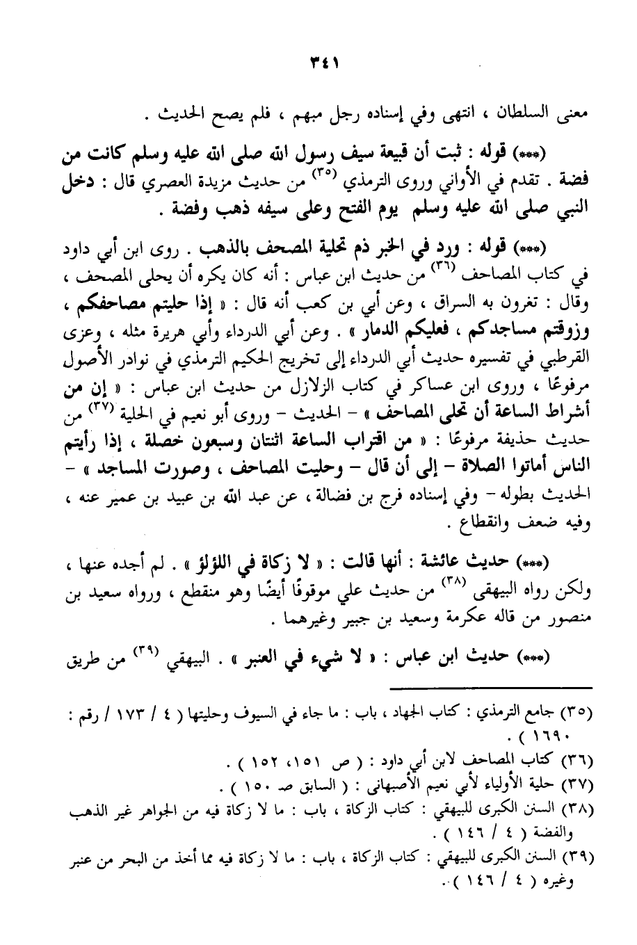 وَرَوَى ابْنُ عَسَاكِرَ فِي كِتَابِ الزَّلَازِلِ مِنْ حَدِيثِ ابْنِ عَبَّاسٍ: «إنَّ مِنْ أَشْرَاطِ السَّاعَةِ أَنْ تُحَلَّى الْمَصَاحِفُ» - الْحَدِيثَ - وَرَوَى أَبُو نُعَيْمٍ فِي الْحِلْيَةِ مِنْ حَدِيثِ حُذَيْفَةَ مَرْفُوعًا: «مِنْ اقْتِرَابِ السَّاعَةِ اثْنَتَانِ وَسَبْعُونَ خَصْلَةً، إذَا رَأَيْتُمْ النَّاسَ أَمَاتُوا الصَّلَاةَ - إلَى أَنْ قَالَ - وَحُلِّيَتْ الْمَصَاحِفُ، وَصُوِّرَتْ الْمَسَاجِدُ» - الْحَدِيثَ بِطُولِهِ - وَفِي إسْنَادِهِ فَرَجُ بْنُ فَضَالَةَ، عَنْ عَبْدِ اللَّهِ بْنِ عُبَيْدِ بْنِ عُمَيْرٍ عَنْهُ وَفِيهِ ضَعْفٌ وَانْقِطَاعٌ.