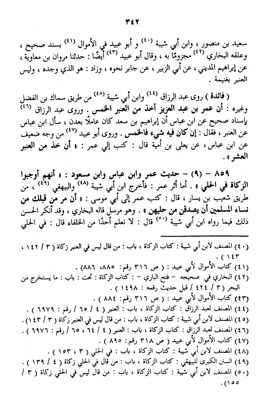 سَعِيدِ بْنِ مَنْصُورٍ، وَابْنِ أَبِي شَيْبَةَ وَأَبُو عُبَيْدٍ فِي الْأَمْوَالِ بِسَنَدٍ صَحِيحٍ، وَعَلَّقَهُ الْبُخَارِيُّ مَجْزُومًا بِهِ، وَقَالَ أَبُو عُبَيْدٍ أَيْضًا: حَدَّثَنَا مَرْوَانُ بْنُ مُعَاوِيَةَ، عَنْ إبْرَاهِيمَ الْمَدِينِيِّ، عَنْ أَبِي الزُّبَيْرِ، عَنْ جَابِرٍ نَحْوَهُ، وَزَادَ: هُوَ الَّذِي وَجَدَهُ، وَلَيْسَ الْعَنْبَرُ بِغَنِيمَةٍ.