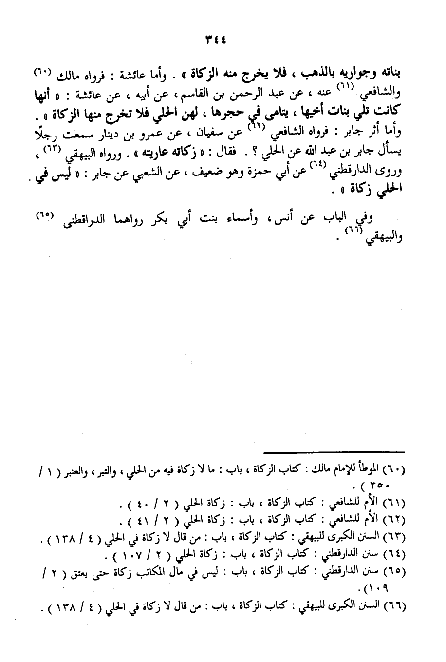 بَنَاتَهُ وَجَوَارِيَهُ بِالذَّهَبِ، فَلَا يُخْرِجُ مِنْهُ الزَّكَاةَ ". وَأَمَّا عَائِشَةُ: فَرَوَاهُ مَالِكٌ وَالشَّافِعِيُّ عَنْهُ، عَنْ عَبْدِ الرَّحْمَنِ بْنِ الْقَاسِمِ، عَنْ أَبِيهِ، عَنْ عَائِشَةَ: " أَنَّهَا كَانَتْ تَلِي بَنَاتَ أَخِيهَا، يَتَامَى فِي حِجْرِهَا، لَهُنَّ الْحُلِيُّ فَلَا تُخْرِجُ مِنْهَا الزَّكَاةَ ". وَأَمَّا أَثَرُ جَابِرٍ: فَرَوَاهُ الشَّافِعِيُّ عَنْ سُفْيَانَ، عَنْ عَمْرِو بْنِ دِينَارٍ سَمِعْت رَجُلًا يَسْأَلُ جَابِرَ بْنَ عَبْدِ اللَّهِ عَنْ الْحُلِيِّ؟ . فَقَالَ: " زَكَاتُهُ عَارِيَّتُهُ ". وَرَوَاهُ الْبَيْهَقِيُّ.