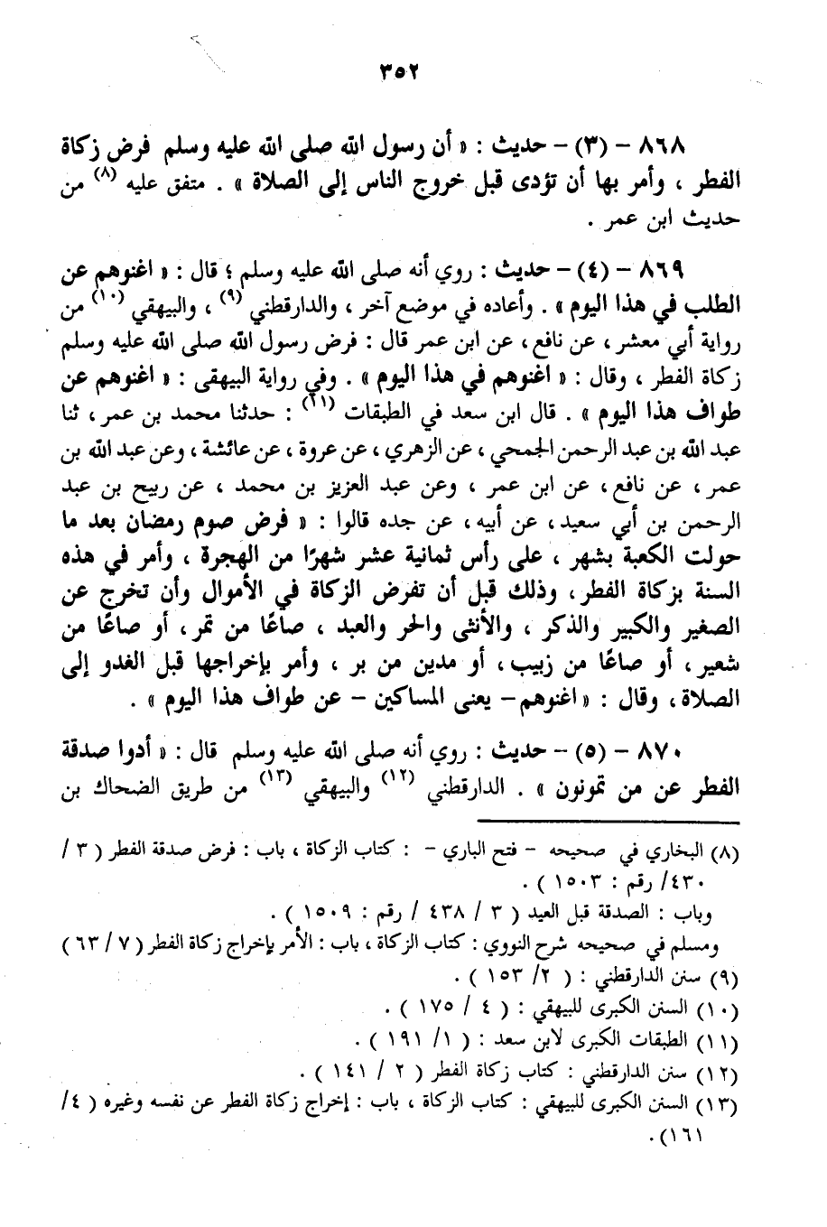 869 - (4) - حَدِيثُ: رُوِيَ أَنَّهُ - صَلَّى اللَّهُ عَلَيْهِ وَسَلَّمَ - قَالَ: «أَغْنُوهُمْ عَنْ الطَّلَبِ فِي هَذَا الْيَوْمِ» . وَأَعَادَهُ فِي مَوْضِعٍ آخَرَ، وَالدَّارَقُطْنِيّ، وَالْبَيْهَقِيُّ مِنْ رِوَايَةِ أَبِي مَعْشَرٍ، عَنْ نَافِعٍ، عَنْ ابْنِ عُمَرَ قَالَ: «فَرَضَ رَسُولُ اللَّهِ - صَلَّى اللَّهُ عَلَيْهِ وَسَلَّمَ - زَكَاةَ الْفِطْرِ، وَقَالَ: أَغْنُوهُمْ فِي هَذَا الْيَوْمِ» . وَفِي رِوَايَةِ الْبَيْهَقِيّ: «أَغْنُوهُمْ عَنْ طَوَافِ هَذَا الْيَوْمِ» .