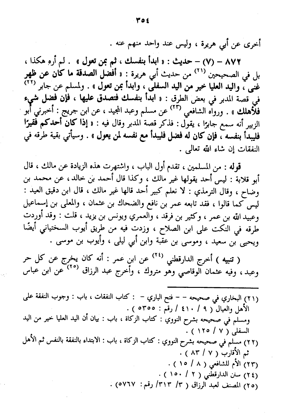 872 - (7) - حَدِيثُ: " «ابْدَأْ بِنَفْسِك، ثُمَّ بِمَنْ تَعُولُ» . لَمْ أَرَهُ هَكَذَا، بَلْ فِي الصَّحِيحَيْنِ مِنْ حَدِيثِ أَبِي هُرَيْرَةَ: «أَفْضَلُ الصَّدَقَةِ مَا كَانَ عَنْ ظَهْرِ غِنًى، وَالْيَدُ الْعُلْيَا خَيْرٌ مِنْ الْيَدِ السُّفْلَى، وَابْدَأْ بِمَنْ تَعُولُ» . وَلِمُسْلِمٍ عَنْ جَابِرٍ فِي قِصَّةِ الْمُدَبَّرِ فِي بَعْضِ الطُّرُقِ. «ابْدَأْ بِنَفْسِك فَتَصَدَّقْ عَلَيْهَا، فَإِنْ فَضَلَ شَيْءٌ فَلِأَهْلِك» . وَرَوَاهُ الشَّافِعِيُّ عَنْ مُسْلِمٍ وَعَبْدُ الْمَجِيدِ، عَنْ ابْنِ جُرَيْجٍ: أَخْبَرَنِي أَبُو الزُّبَيْرِ أَنَّهُ سَمِعَ جَابِرًا، يَقُولُ: فَذَكَرَ قِصَّةَ الْمُدَبَّرِ وَقَالَ فِيهِ: «إذَا كَانَ أَحَدُكُمْ فَقِيرًا فَلْيَبْدَأْ بِنَفْسِهِ، فَإِنْ كَانَ لَهُ فَضْلٌ فَلْيَبْدَأْ مَعَ نَفْسِهِ لِمَنْ يَعُولُ» . وَسَيَأْتِي بَقِيَّةُ طُرُقِهِ فِي النَّفَقَاتِ إنْ شَاءَ اللَّهُ تَعَالَى. قَوْلُهُ: مِنْ الْمُسْلِمِينَ، تَقَدَّمَ أَوَّلَ الْبَابِ، وَاشْتُهِرَتْ هَذِهِ الزِّيَادَةُ عَنْ مَالِكٍ، قَالَ أَبُو قِلَابَةَ: لَيْسَ أَحَدٌ يَقُولُهَا غَيْرُ مَالِكٍ، وَكَذَا قَالَ أَحْمَدُ بْنُ خَالِدٍ، عَنْ مُحَمَّدِ بْنِ وَضَّاحٍ، وَقَالَ التِّرْمِذِيُّ: لَا نَعْلَمُ كَبِيرَ أَحَدٍ قَالَهَا غَيْرَ مَالِكٍ، قَالَ ابْنُ دَقِيقِ الْعِيدِ: لَيْسَ كَمَا قَالُوا، فَقَدْ تَابَعَهُ عُمَرُ بْنُ نَافِعٍ وَالضَّحَّاكُ بْنُ عُثْمَانَ، وَالْمُعَلَّى بْنُ إسْمَاعِيلَ وَعُبَيْدُ اللَّهِ بْنُ عُمَرَ، وَكَثِيرُ بْنُ فَرْقَدٍ، وَالْعُمَرِيُّ وَيُونُسُ بْنُ يَزِيدَ، قُلْت: وَقَدْ أَوْرَدْت طُرُقَهُ فِي النُّكَتِ عَلَى ابْنِ الصَّلَاحِ، وَزِدْت فِيهِ مِنْ طَرِيقِ أَيُّوبَ السِّخْتِيَانِيِّ أَيْضًا وَيَحْيَى بْنِ سَعِيدٍ، وَمُوسَى بْنِ عُقْبَةَ وَابْنِ أَبِي لَيْلَى، وَأَيُّوبَ بْنِ مُوسَى.