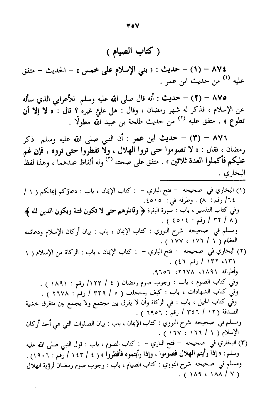 (كِتَابُ الصِّيَامِ) 874 - (1) - حَدِيثُ: " «بُنِيَ الْإِسْلَامُ عَلَى خَمْسٍ» - الْحَدِيثُ - مُتَّفَقٌ عَلَيْهِ مِنْ حَدِيثِ ابْنِ عُمَرَ.