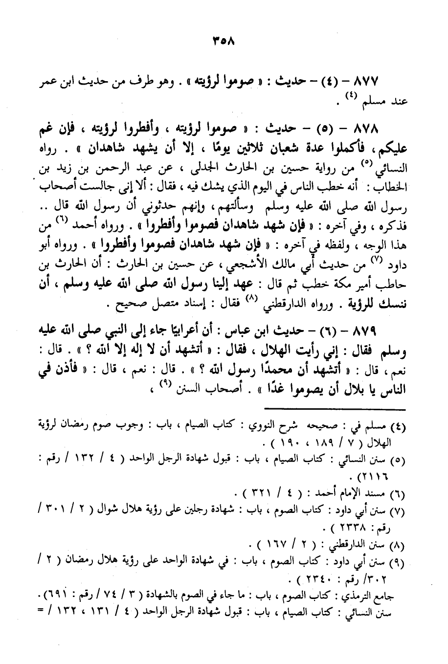 878 - (5) - حَدِيثُ: «صُومُوا لِرُؤْيَتِهِ، وَأَفْطِرُوا لِرُؤْيَتِهِ، فَإِنْ غُمَّ عَلَيْكُمْ، فَأَكْمِلُوا عِدَّةَ شَعْبَانَ ثَلَاثِينَ يَوْمًا، إلَّا أَنْ يَشْهَدَ شَاهِدَانِ» . رَوَاهُ النَّسَائِيُّ مِنْ رِوَايَةِ حُسَيْنِ بْنِ الْحَارِثِ الْجَدَلِيِّ، عَنْ عَبْدِ الرَّحْمَنِ بْنِ زَيْدِ بْنِ الْخَطَّابِ: أَنَّهُ خَطَبَ النَّاسَ فِي الْيَوْمِ الَّذِي يُشَكُّ فِيهِ، فَقَالَ: أَلَا إنِّي جَالَسْت أَصْحَابَ رَسُولِ اللَّهِ - صَلَّى اللَّهُ عَلَيْهِ وَسَلَّمَ - وَسَأَلْتهمْ، وَإِنَّهُمْ حَدَّثُونِي أَنَّ رَسُولَ اللَّهِ قَالَ. . . فَذَكَرَهُ، وَفِي آخِرِهِ: «فَإِنْ شَهِدَ شَاهِدَانِ فَصُومُوا وَأَفْطِرُوا» . وَرَوَاهُ أَحْمَدُ مِنْ هَذَا الْوَجْهِ، وَلَفْظُهُ فِي آخِرِهِ: «فَإِنْ شَهِدَ شَاهِدَانِ فَصُومُوا وَأَفْطِرُوا» . وَرَوَاهُ أَبُو دَاوُد مِنْ حَدِيثِ أَبِي مَالِكٍ الْأَشْجَعِيِّ، عَنْ حُسَيْنِ بْنِ الْحَارِثِ: أَنَّ الْحَارِثَ بْنَ حَاطِبٍ أَمِيرَ مَكَّةَ خَطَبَ ثُمَّ قَالَ: عَهِدَ إلَيْنَا رَسُولُ اللَّهِ - صَلَّى اللَّهُ عَلَيْهِ وَسَلَّمَ -، أَنْ نَنْسُكَ لِلرُّؤْيَةِ. وَرَوَاهُ الدَّارَقُطْنِيُّ فَقَالَ: إسْنَادٌ مُتَّصِلٌ صَحِيحٌ.