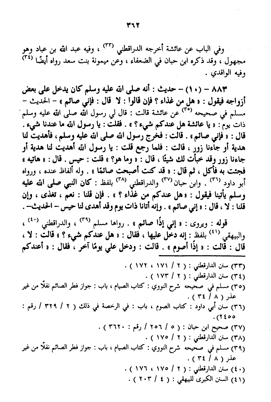 883 - (10) - حَدِيثُ: «أَنَّهُ - صَلَّى اللَّهُ عَلَيْهِ وَسَلَّمَ - كَانَ يَدْخُلُ عَلَى بَعْضِ أَزْوَاجِهِ فَيَقُولُ: هَلْ مِنْ غِذَاءٍ؟ فَإِنْ قَالُوا: لَا قَالَ: فَإِنِّي صَائِمٌ» - الْحَدِيثَ - مُسْلِمٌ فِي صَحِيحِهِ «عَنْ عَائِشَةَ قَالَتْ: قَالَ لِي رَسُولُ اللَّهِ - صَلَّى اللَّهُ عَلَيْهِ وَسَلَّمَ - ذَاتَ يَوْمٍ: يَا عَائِشَةُ هَلْ عِنْدَكُمْ شَيْءٌ؟ . فَقُلْت: يَا رَسُولَ اللَّهِ مَا عِنْدَنَا شَيْءٌ قَالَ: فَإِنِّي صَائِمٌ. قَالَتْ: فَخَرَجَ رَسُولُ اللَّهِ - صَلَّى اللَّهُ عَلَيْهِ وَسَلَّمَ -، فَأُهْدِيَتْ لَنَا هَدِيَّةٌ أَوْ جَاءَنَا زَوْرٌ، قَالَتْ: فَلَمَّا رَجَعَ قُلْت: يَا رَسُولَ اللَّهِ أُهْدِيَتْ لَنَا هَدِيَّةٌ أَوْ جَاءَنَا زَوْرٌ وَقَدْ خَبَّأْت لَك شَيْئًا، قَالَ: وَمَا هُوَ؟ قُلْت: حَيْسٌ. قَالَ: هَاتِيهِ فَجِئْت بِهِ فَأَكَلَ، ثُمَّ قَالَ: قَدْ كُنْت أَصْبَحْت صَائِمًا» وَلَهُ أَلْفَاظٌ عِنْدَهُ، وَرَوَاهُ أَبُو دَاوُد. وَابْنُ حِبَّانَ وَالدَّارَقُطْنِيّ بِلَفْظٍ: «كَانَ النَّبِيُّ - صَلَّى اللَّهُ عَلَيْهِ وَسَلَّمَ - يَأْتِينَا فَيَقُولُ: هَلْ عِنْدَكُمْ مِنْ غِذَاءٍ؟» . فَإِنْ قُلْنَا: نَعَمْ، تَغَذَّى، وَإِنْ قُلْنَا: لَا، قَالَ: " إنِّي صَائِمٌ " وَإِنَّهُ أَتَانَا ذَاتَ يَوْمٍ وَقَدْ أُهْدِيَ لَنَا حَيْسٌ - الْحَدِيثَ -. قَوْلُهُ: وَيُرْوَى: «إنِّي إذًا صَائِمٌ» . رَوَاهَا مُسْلِمٌ، وَالدَّارَقُطْنِيّ، وَالْبَيْهَقِيُّ بِلَفْظِ: أَنَّهُ دَخَلَ عَلَيْهَا، فَقَالَ: «هَلْ عِنْدَكُمْ شَيْءٌ؟ قَالَتْ لَا، قَالَ: قَالَتْ: إذًا أَصُومُ. قَالَتْ: وَدَخَلَ عَلَيَّ يَوْمًا آخَرَ، فَقَالَ: أَعْنَدَكُمْ