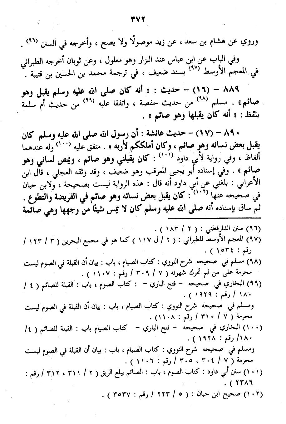 890 - (17) - حَدِيثُ عَائِشَةَ: أَنَّ «رَسُولَ اللَّهِ - صَلَّى اللَّهُ عَلَيْهِ وَسَلَّمَ - كَانَ يُقَبِّلُ بَعْضَ نِسَائِهِ وَهُوَ صَائِمٌ، وَكَانَ أَمْلَكَكُمْ لِإِرْبِهِ» . مُتَّفَقٌ عَلَيْهِ وَلَهُ عِنْدَهُمَا أَلْفَاظٌ، وَفِي رِوَايَةٍ لِأَبِي دَاوُد: «كَانَ يُقَبِّلُنِي وَهُوَ صَائِمٌ، وَيَمُصُّ لِسَانِي وَهُوَ صَائِمٌ» . وَفِي إسْنَادِهِ أَبُو يَحْيَى الْمُعَرْقِبُ وَهُوَ ضَعِيفٌ، وَقَدْ وَثَّقَهُ الْعِجْلِيُّ، قَالَ ابْنُ الْأَعْرَابِيِّ: بَلَغَنِي عَنْ أَبِي دَاوُد أَنَّهُ قَالَ: هَذِهِ الرِّوَايَةُ لَيْسَتْ بِصَحِيحَةٍ، وَلِابْنِ حِبَّانَ فِي صَحِيحِهِ عَنْهَا: كَانَ يُقَبِّلُ بَعْضَ نِسَائِهِ وَهُوَ صَائِمٌ فِي الْفَرِيضَةِ وَالتَّطَوُّعِ. ثُمَّ سَاقَ بِإِسْنَادِهِ أَنَّهُ - صَلَّى اللَّهُ عَلَيْهِ وَسَلَّمَ - كَانَ لَا يَمَسُّ شَيْئًا مِنْ وَجْهِهَا وَهِيَ صَائِمَةٌ
