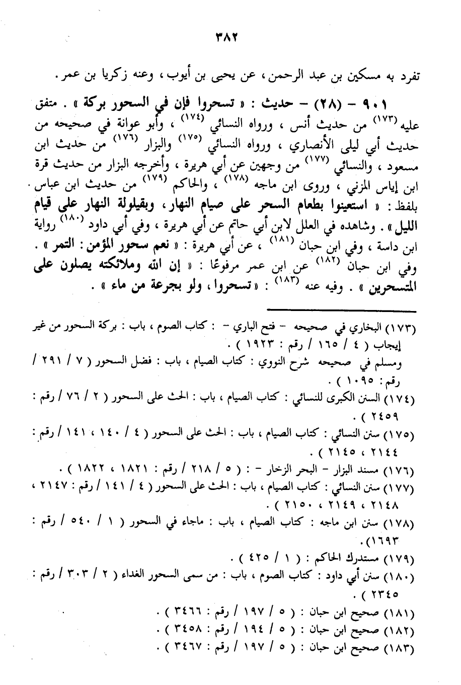 901 - (28) - حَدِيثُ: «تَسَحَّرُوا فَإِنَّ فِي السَّحُورِ بَرَكَةً» . مُتَّفَقٌ عَلَيْهِ مِنْ حَدِيثِ أَنَسٍ، وَرَوَاهُ النَّسَائِيُّ، وَأَبُو عَوَانَةَ فِي صَحِيحِهِ مِنْ حَدِيثِ أَبِي لَيْلَى الْأَنْصَارِيِّ، وَرَوَاهُ النَّسَائِيُّ وَالْبَزَّارُ مِنْ حَدِيثِ ابْنِ مَسْعُودٍ، وَالنَّسَائِيُّ مِنْ وَجْهَيْنِ عَنْ أَبِي هُرَيْرَةَ، وَأَخْرَجَهُ الْبَزَّارُ مِنْ حَدِيثِ قُرَّةَ بْنِ إيَاسٍ الْمُزَنِيِّ.