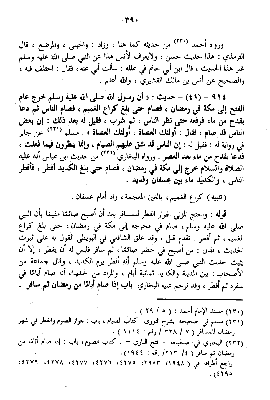 914 - (41) - حَدِيثُ: «أَنَّ رَسُولَ اللَّهِ - صَلَّى اللَّهُ عَلَيْهِ وَسَلَّمَ - خَرَجَ عَامَ الْفَتْحِ إلَى مَكَّةَ فِي رَمَضَانَ، فَصَامَ حَتَّى بَلَغَ كُرَاعَ الْغَمِيمِ، فَصَامَ النَّاسُ ثُمَّ دَعَا بِقَدَحٍ مِنْ مَاءٍ فَرَفَعَهُ حَتَّى نَظَرَ النَّاسُ، ثُمَّ شَرِبَ، فَقِيلَ لَهُ بَعْدَ ذَلِكَ: إنَّ بَعْضَ النَّاسِ قَدْ صَامَ، فَقَالَ: أُولَئِكَ الْعُصَاةُ، أُولَئِكَ الْعُصَاةُ» مُسْلِمٌ عَنْ جَابِرٍ. وَفِي رِوَايَةٍ لَهُ: فَقِيلَ لَهُ: «إنَّ النَّاسَ قَدْ شَقَّ عَلَيْهِمْ الصِّيَامُ، وَإِنَّمَا يَنْظُرُونَ فِيمَا فَعَلْتَ، فَدَعَا بِقَدَحٍ مِنْ مَاءٍ بَعْدَ الْعَصْرِ.» وَرَوَاهُ الْبُخَارِيُّ مِنْ حَدِيثِ ابْنِ عَبَّاسٍ أَنَّهُ - عَلَيْهِ الصَّلَاةُ وَالسَّلَامُ - خَرَجَ إلَى مَكَّةَ فِي رَمَضَانَ، فَصَامَ حَتَّى بَلَغَ الْكَدِيدَ أَفْطَرَ، فَأَفْطَرَ النَّاسُ، وَالْكَدِيدُ مَاءٌ بَيْنَ عُسْفَانَ وَقَدِيدٍ.