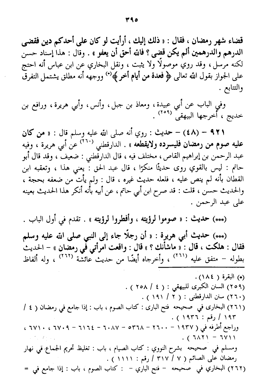 921 - (48) - حَدِيثُ: رُوِيَ أَنَّهُ - صَلَّى اللَّهُ عَلَيْهِ وَسَلَّمَ - قَالَ: «مَنْ كَانَ عَلَيْهِ صَوْمٌ مِنْ رَمَضَانَ فَلْيَسْرُدْهُ وَلَا يُقَطِّعْهُ» . الدَّارَقُطْنِيُّ عَنْ أَبِي هُرَيْرَةَ، وَفِيهِ عَبْدُ الرَّحْمَنِ بْنُ إبْرَاهِيمَ الْقَاصُّ، مُخْتَلَفٌ فِيهِ، قَالَ الدَّارَقُطْنِيُّ: ضَعِيفٌ، وَقَدْ قَالَ أَبُو حَاتِمٍ: لَيْسَ بِالْقَوِيِّ رَوَى حَدِيثًا مُنْكَرًا، قَالَ عَبْدُ الْحَقِّ: يَعْنِي هَذَا، وَتَعَقَّبَهُ ابْنُ الْقَطَّانِ بِأَنَّهُ لَمْ يَنُصَّ عَلَيْهِ، فَلَعَلَّهُ حَدِيثٌ غَيْرُهُ، قَالَ: وَلَمَّا يَأْتِ مَنْ ضَعَّفَهُ بِحُجَّةٍ، وَالْحَدِيثُ حَسَنٌ، قُلْت: قَدْ صَرَّحَ ابْنُ أَبِي حَاتِمٍ، عَنْ أَبِيهِ بِأَنَّهُ أَنْكَرَ هَذَا الْحَدِيثَ بِعَيْنِهِ عَلَى عَبْدِ الرَّحْمَنِ.