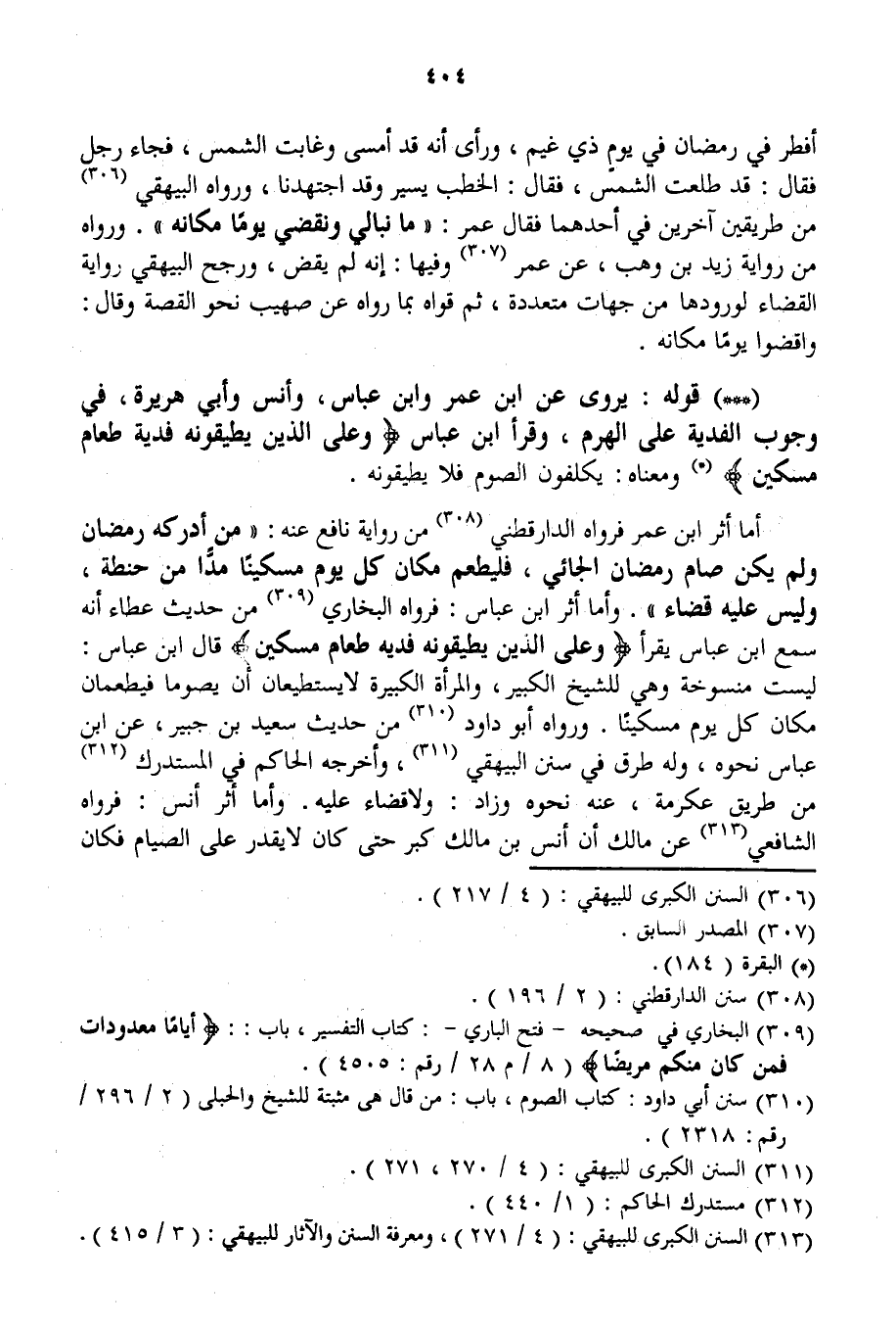 أَمَّا أَثَرُ ابْنِ عُمَرَ فَرَوَاهُ الدَّارَقُطْنِيُّ مِنْ رِوَايَةِ نَافِعٍ عَنْهُ: " مَنْ أَدْرَكَهُ رَمَضَانُ وَلَمْ يَكُنْ صَامَ رَمَضَانَ الْجَائِيَ، فَلْيُطْعِمْ مَكَانَ كُلِّ يَوْمٍ مِسْكِينًا مُدًّا مِنْ حِنْطَةٍ، وَلَيْسَ عَلَيْهِ قَضَاءٌ ". وَأَمَّا أَثَرُ ابْنِ عَبَّاسٍ: فَرَوَاهُ الْبُخَارِيُّ مِنْ حَدِيثِ عَطَاءٍ أَنَّهُ سَمِعَ ابْنَ عَبَّاسٍ يَقْرَأُ {وَعَلَى الَّذِينَ يُطِيقُونَهُ فِدْيَةٌ طَعَامُ مِسْكِينٍ} [البقرة: 184] قَالَ ابْنُ عَبَّاسٍ: لَيْسَتْ مَنْسُوخَةً وَهِيَ لِلشَّيْخِ الْكَبِيرِ، وَالْمَرْأَةِ الْكَبِيرَةِ لَا يَسْتَطِيعَانِ أَنْ يَصُومَا فَيُطْعِمَانِ مَكَانَ كُلِّ يَوْمٍ مِسْكِينًا. وَرَوَاهُ أَبُو دَاوُد مِنْ حَدِيثِ سَعِيدِ بْنِ جُبَيْرٍ، عَنْ ابْنِ عَبَّاسٍ نَحْوَهُ، وَلَهُ طُرُقٌ فِي سُنَنِ الْبَيْهَقِيّ، وَأَخْرَجَهُ الْحَاكِمُ فِي الْمُسْتَدْرَكِ مِنْ طَرِيقِ عِكْرِمَةَ عَنْهُ نَحْوَهُ وَزَادَ: وَلَا قَضَاءَ عَلَيْهِ. وَأَمَّا أَثَرُ أَنَسٍ: فَرَوَاهُ الشَّافِعِيُّ عَنْ مَالِكٍ أَنَّ أَنَسَ بْنَ مَالِكٍ كَبُرَ حَتَّى كَانَ لَا يَقْدِرُ عَلَى الصِّيَامِ فَكَانَ